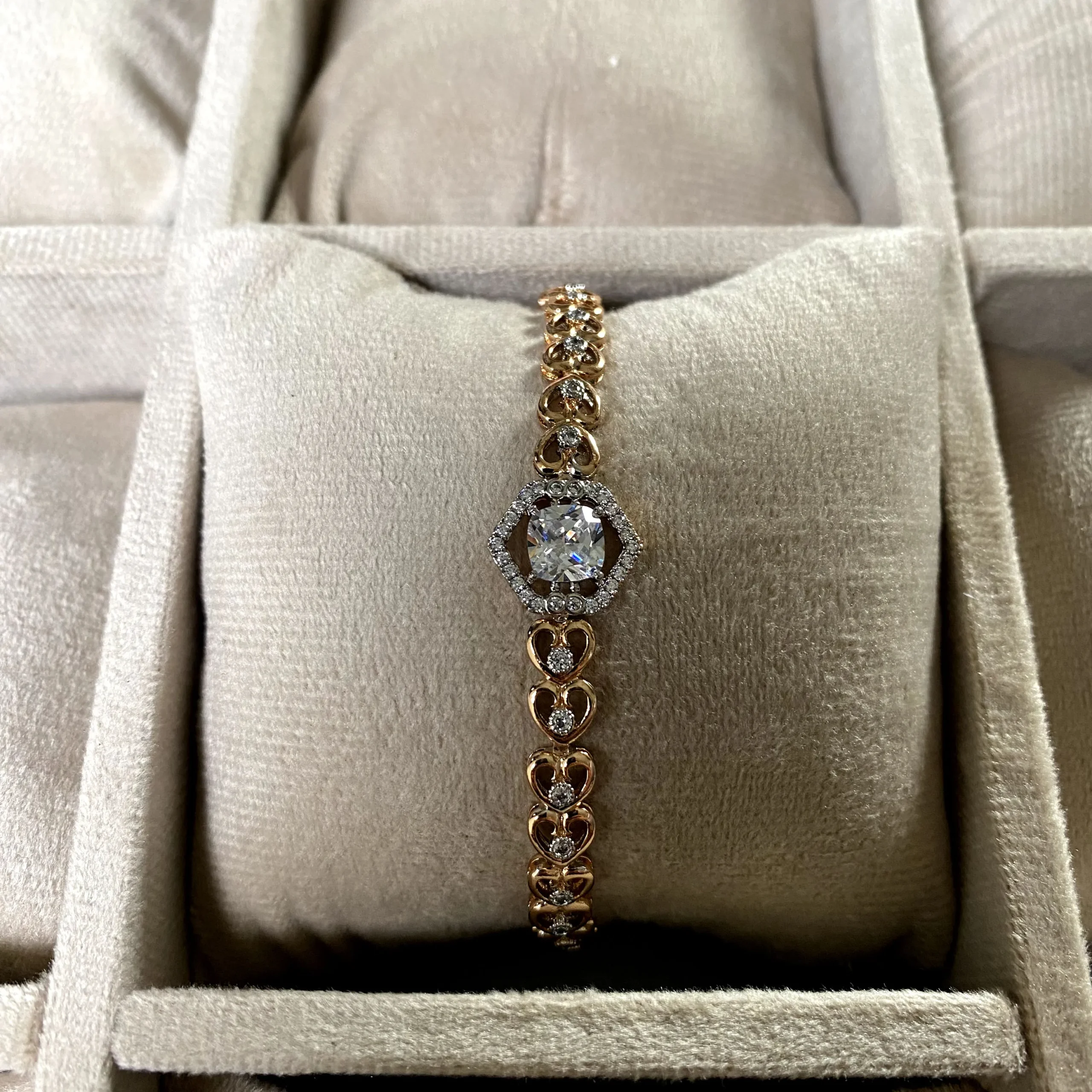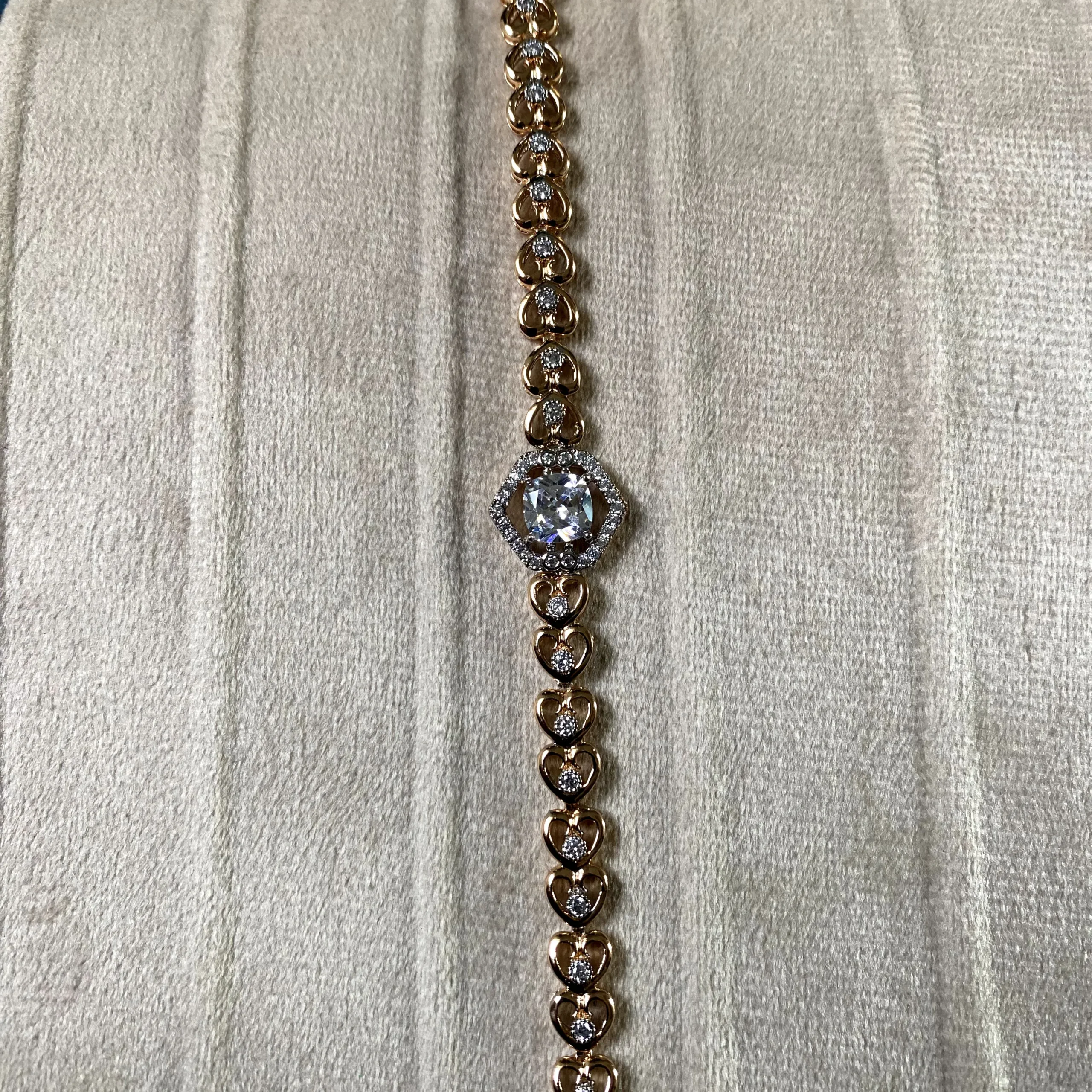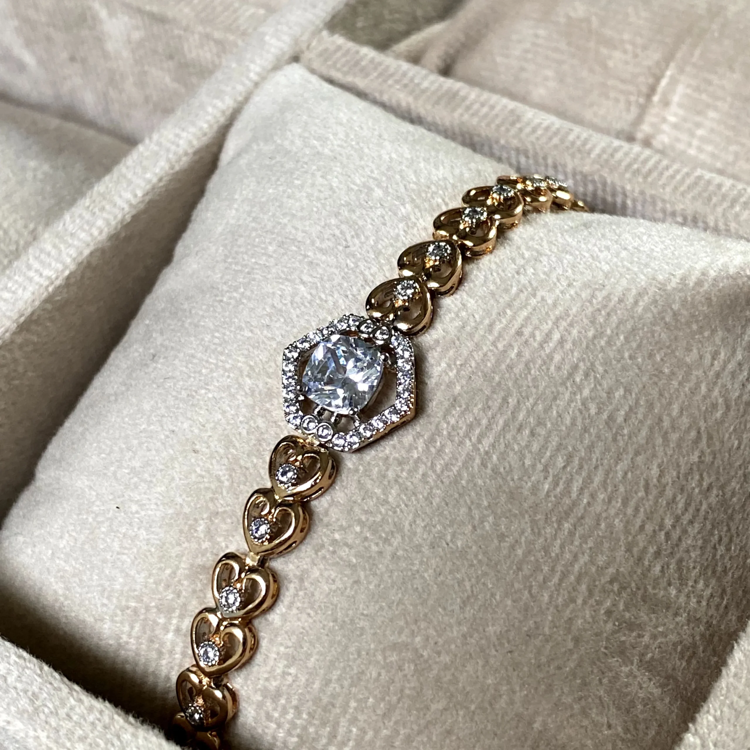 A 21k gold plated bracelet adorned with tiny hearts and shimmering zircon accents, finished with a radiant stone centerpiece.