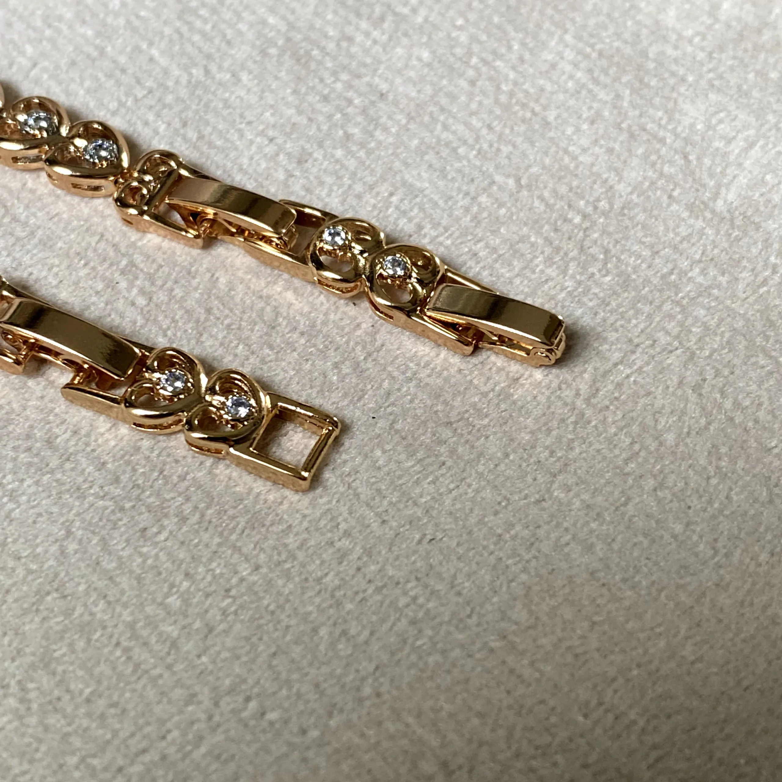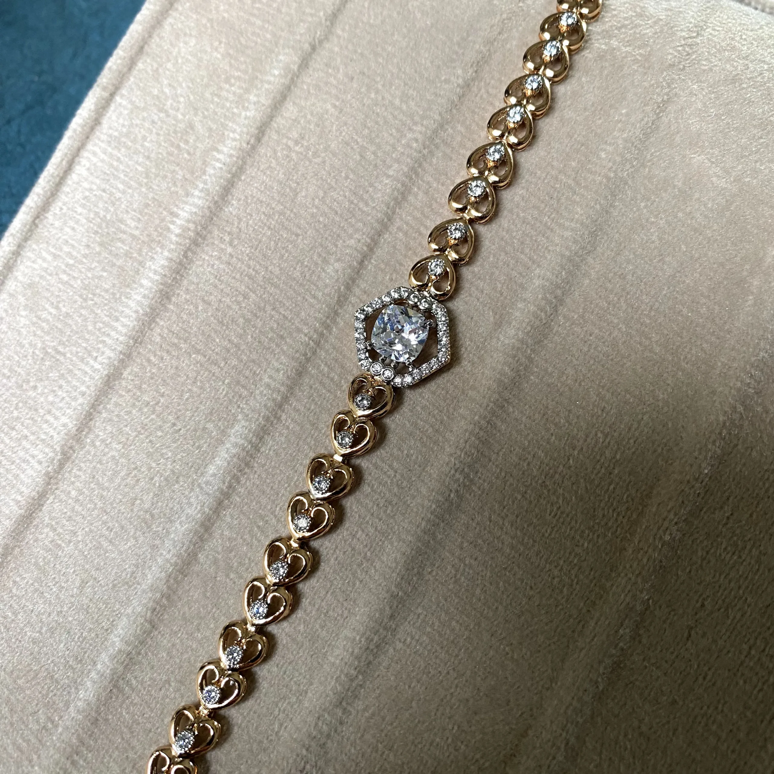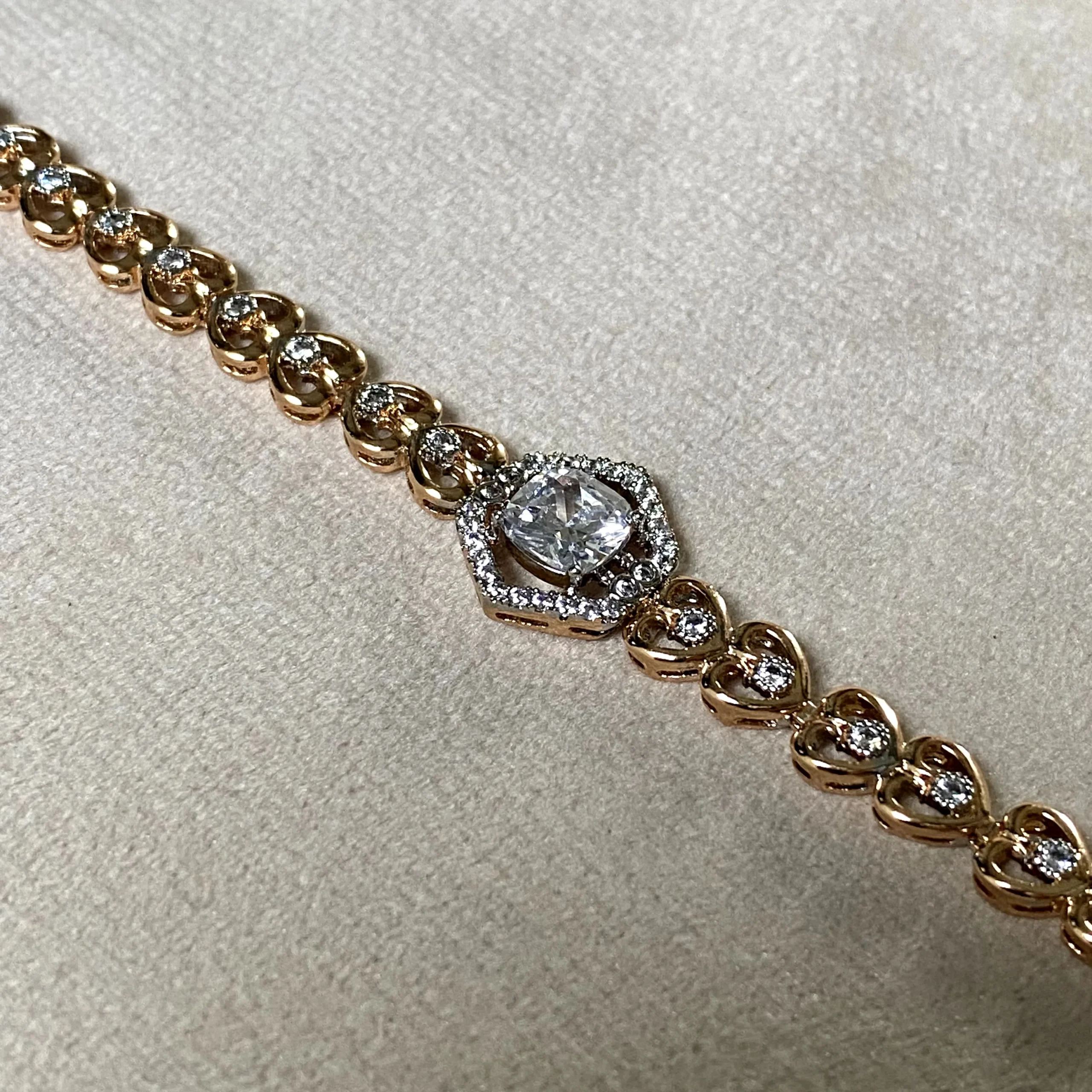 A 21k gold plated bracelet adorned with tiny hearts and shimmering zircon accents, finished with a radiant stone centerpiece.
