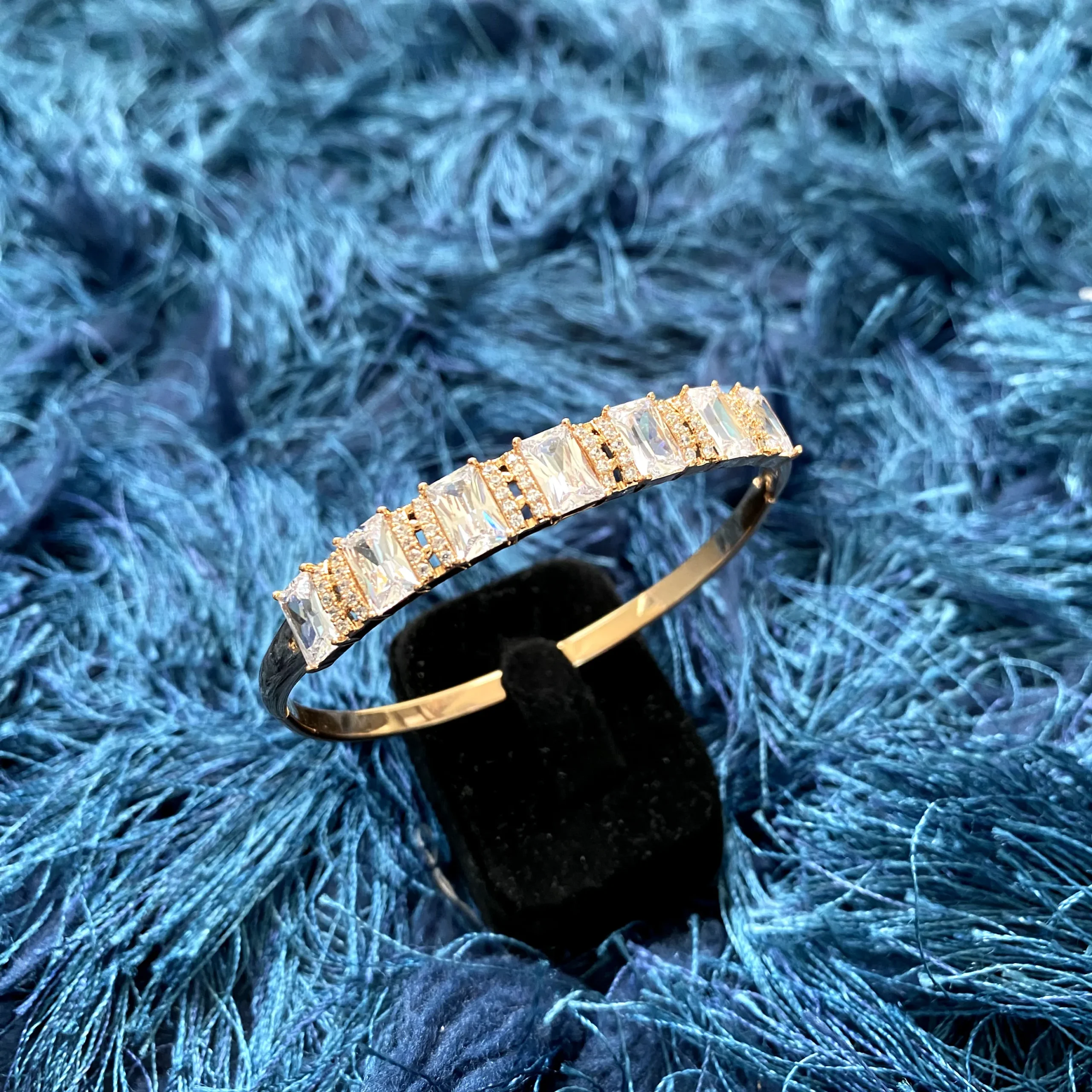 A 21k gold plated bangle lined with clear rectangular gemstones, creating a sleek band of sparkle.