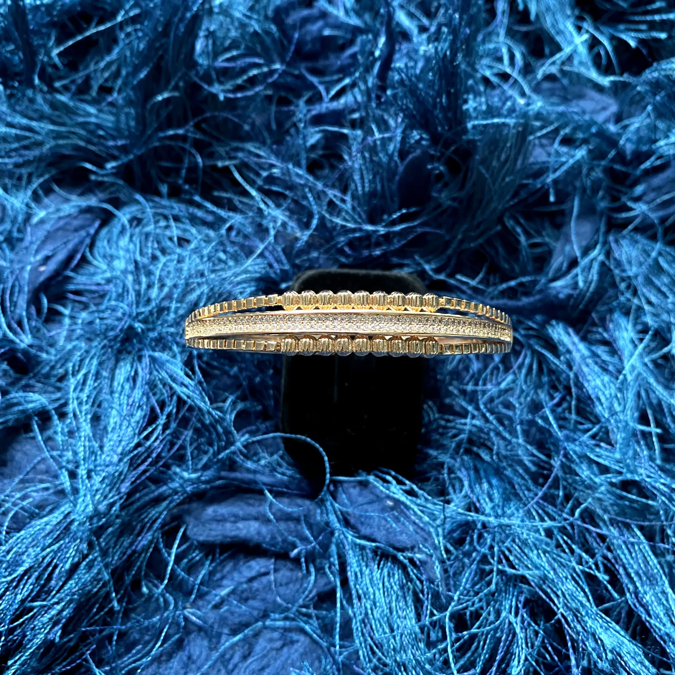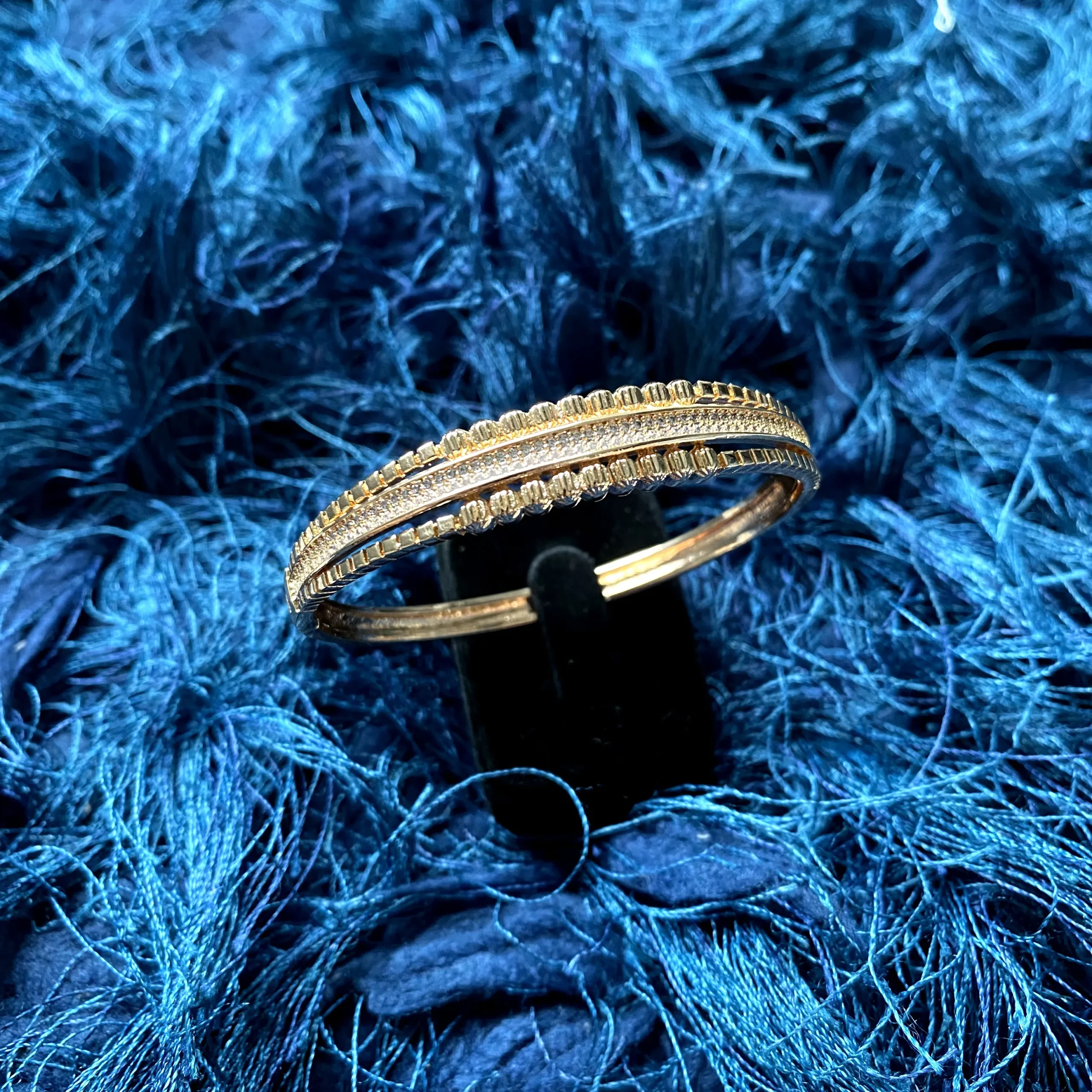 A 21k gold-plated bangle with dual bands, accented by textured cube and rounded motifs for a sophisticated, timeless appeal.