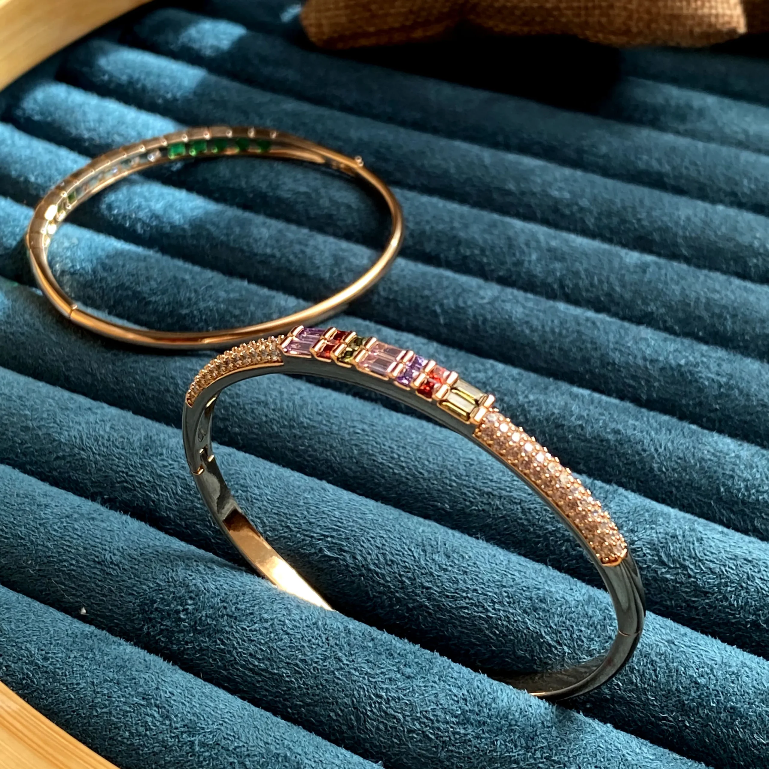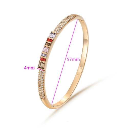 An 18k gold-plated bangle with a vibrant centrepiece of multicoloured stones, framed by rows of sparkling zircons.