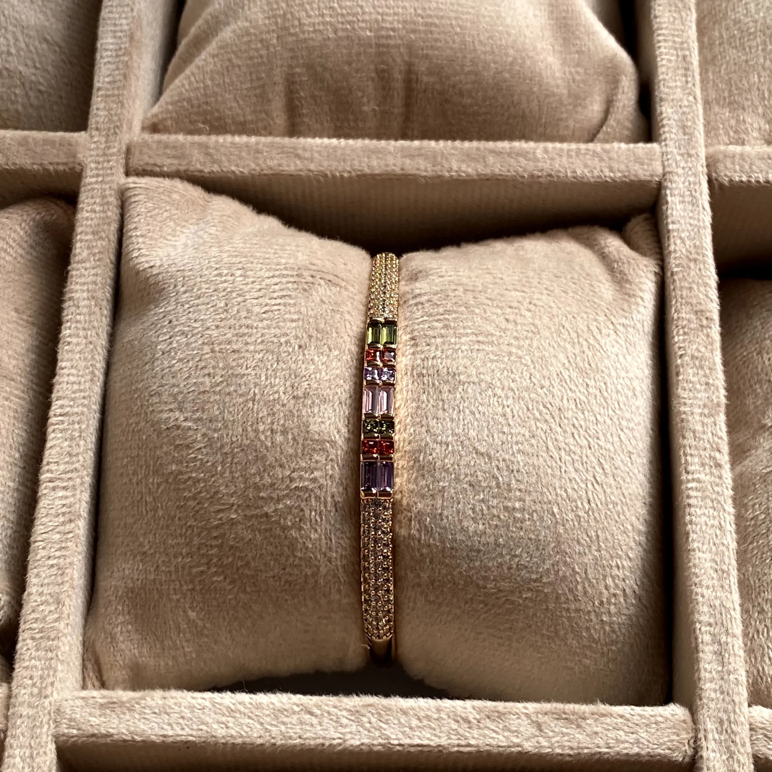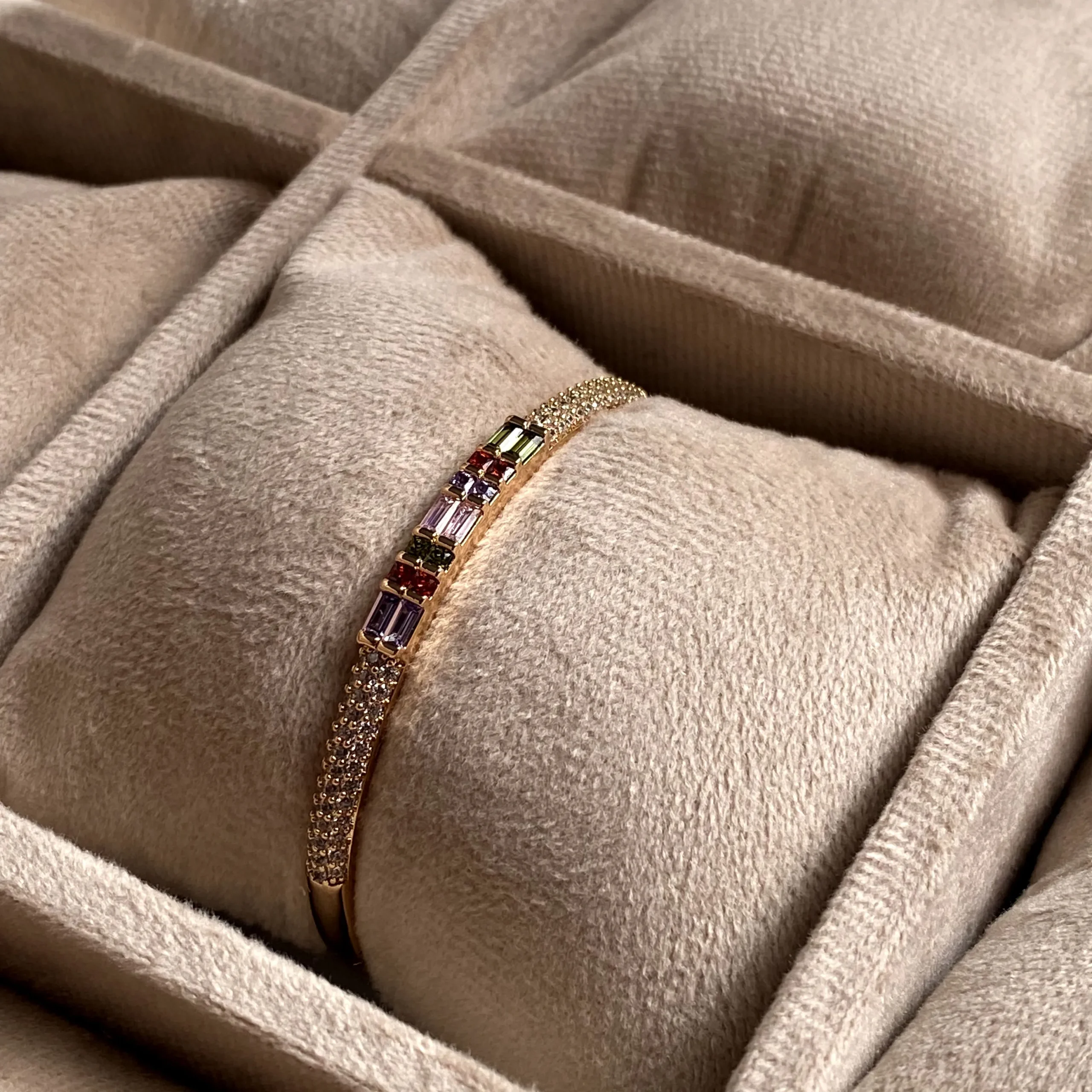 Designed to celebrate color and brilliance, this 18k gold-plated bangle features a striking centrepiece adorned with stones in square and baguette cuts. Shades of pink, green, blue, and red come together in a harmonious blend, creating a focal point that feels both lively and refined.