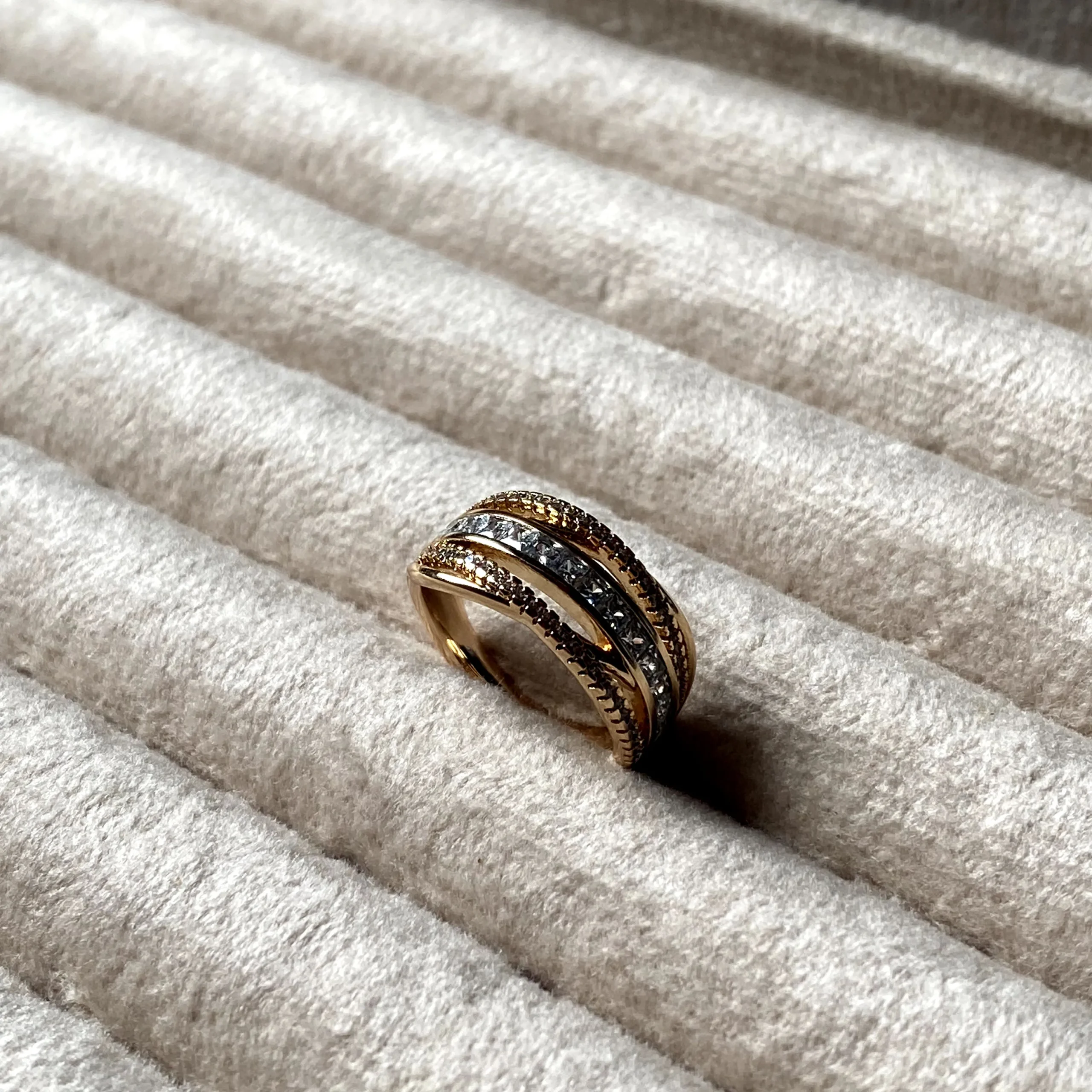 A bold 21k gold-plated multi-row ring with a centre channel of square-cut zircons and raised borders lined with tiny round stones.