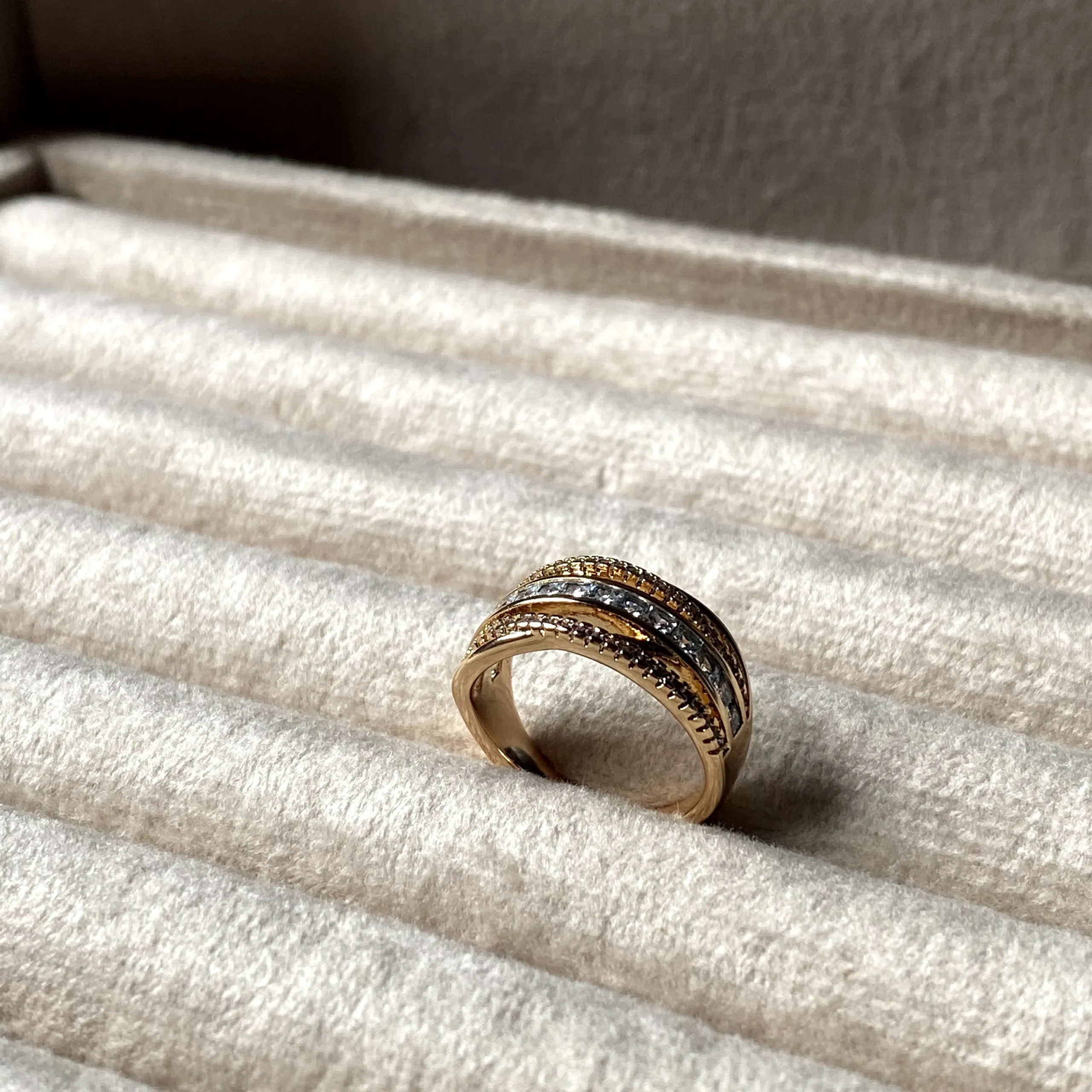 Crafted in 21k gold plating, this ring exudes luxury with its multi-row design. At its centre lies a sleek channel of square-cut zircon stones, framed by raised borders that sparkle with rows of tiny round-cut zircons. The band is slightly wider than standard rings, giving it a bold yet refined presence. Perfect as a statement piece, this design balances brilliance with structure, making it a standout addition to any collection.