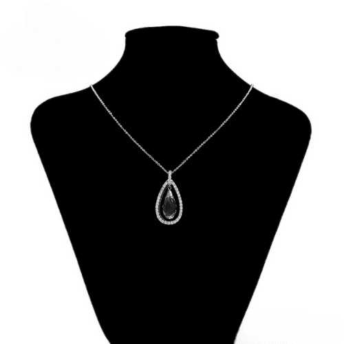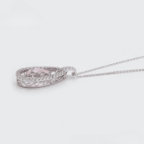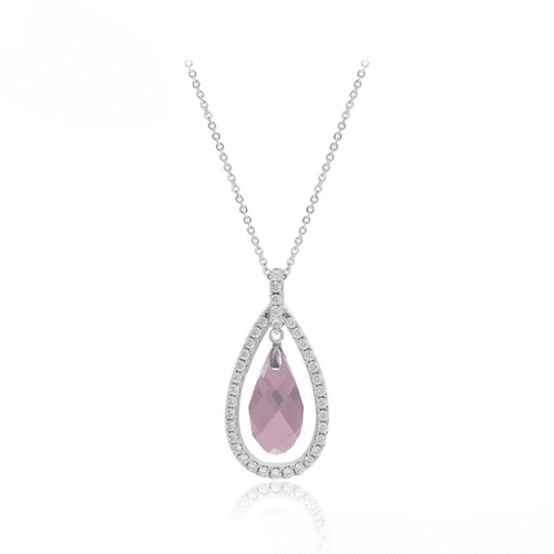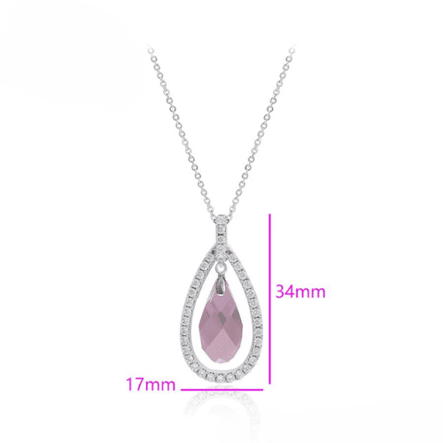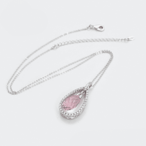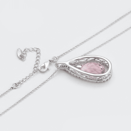 The Elara pendant features a soft pink crystal suspended within a platinum-plated teardrop frame. Its graceful silhouette and subtle sparkle make it a timeless piece for everyday elegance.