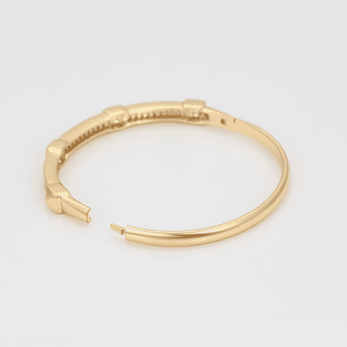 Elegant and distinctive, this 14k gold-plated bangle features a unique upper design divided into three refined sections. Four raised cube accents with pointed centres create the partitions, adding subtle dimension and structure. Each section is filled with delicate round stones, catching the light and creating a seamless sparkle across the piece.