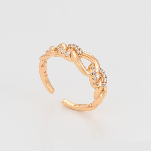 Entwine is a gold plated adjustable ring featuring an interlinked design accented with delicate clear stones. Elegant, modern, and crafted for effortless everyday wear.