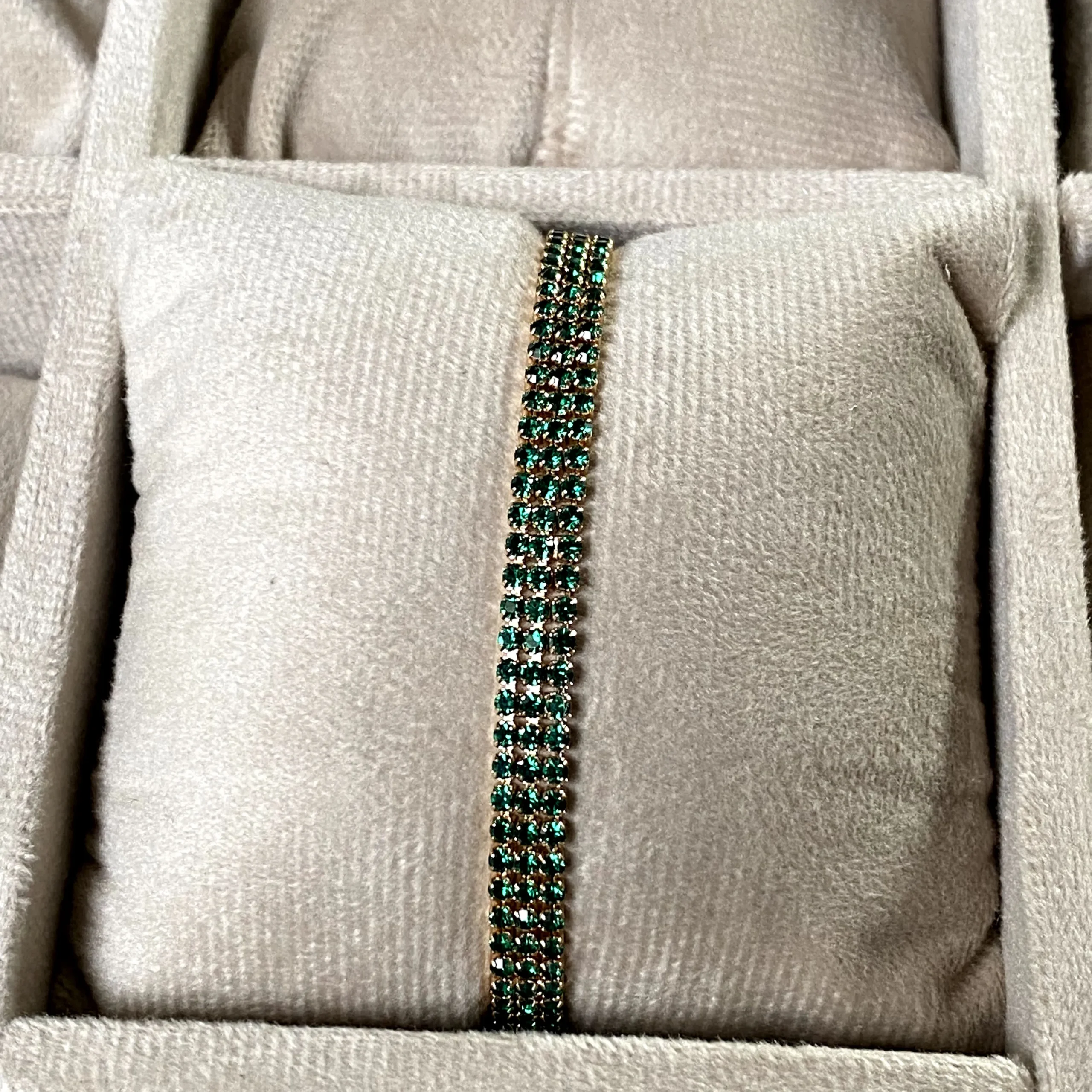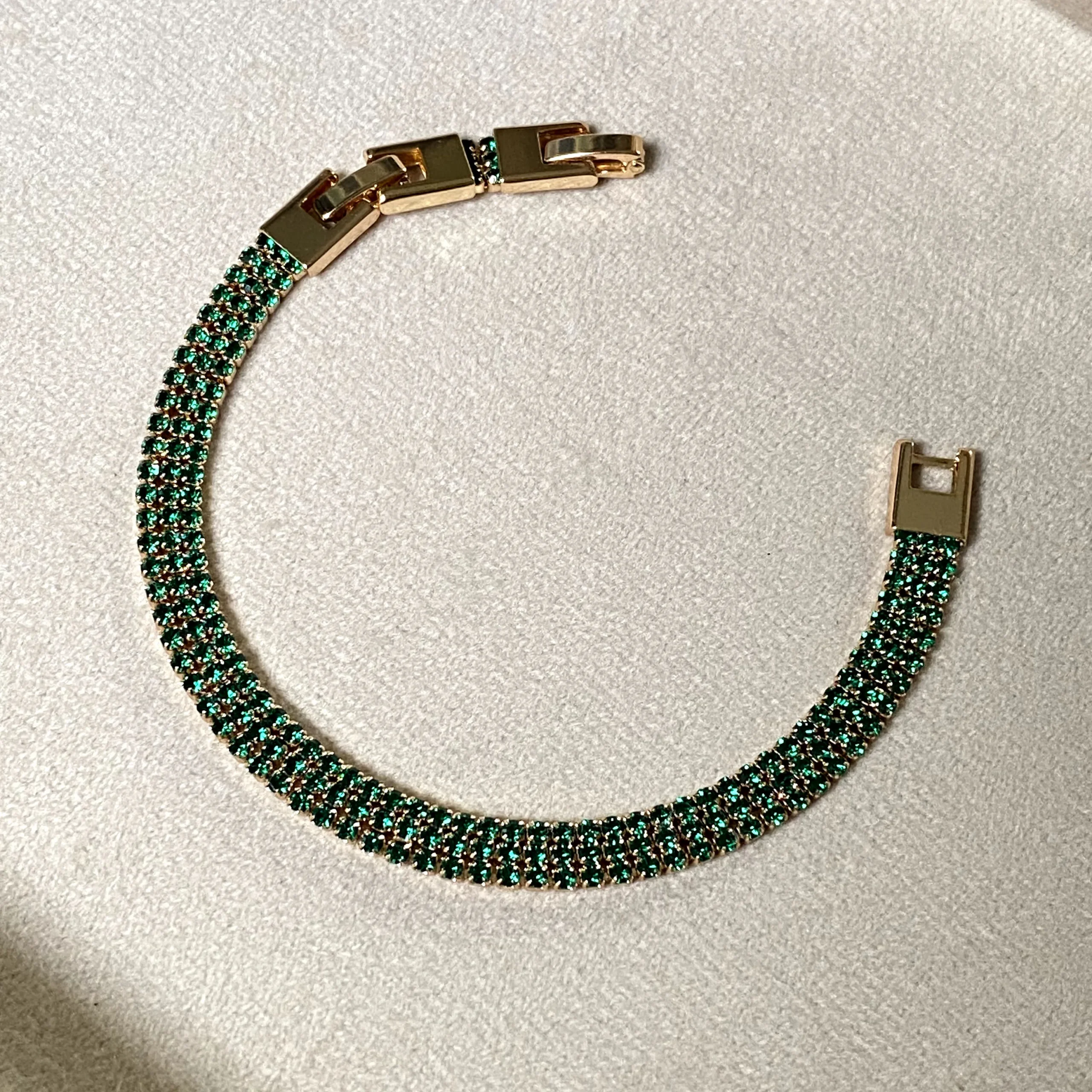 A classic tennis bracelet featuring deep emerald-toned stones, set in a refined design that radiates timeless elegance.