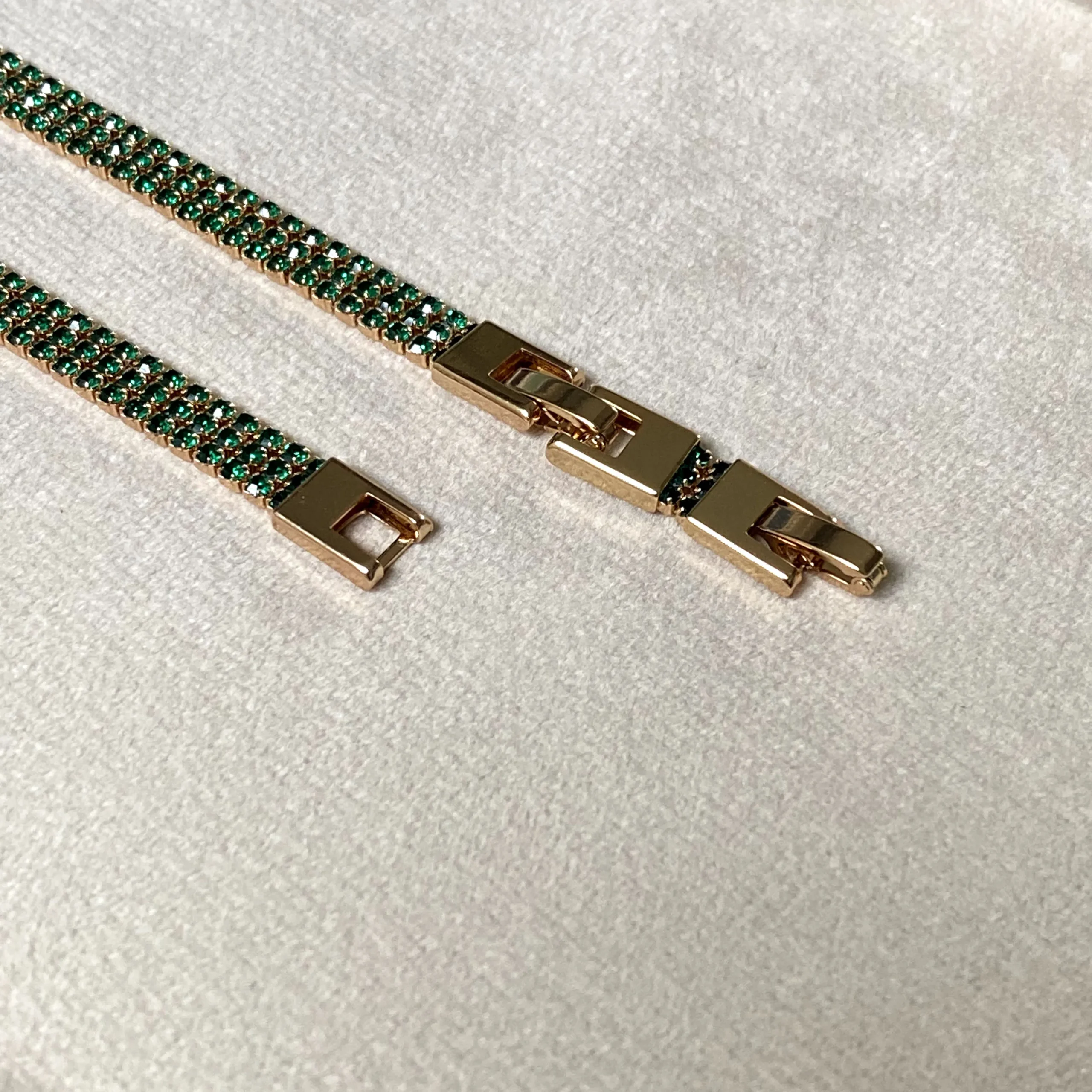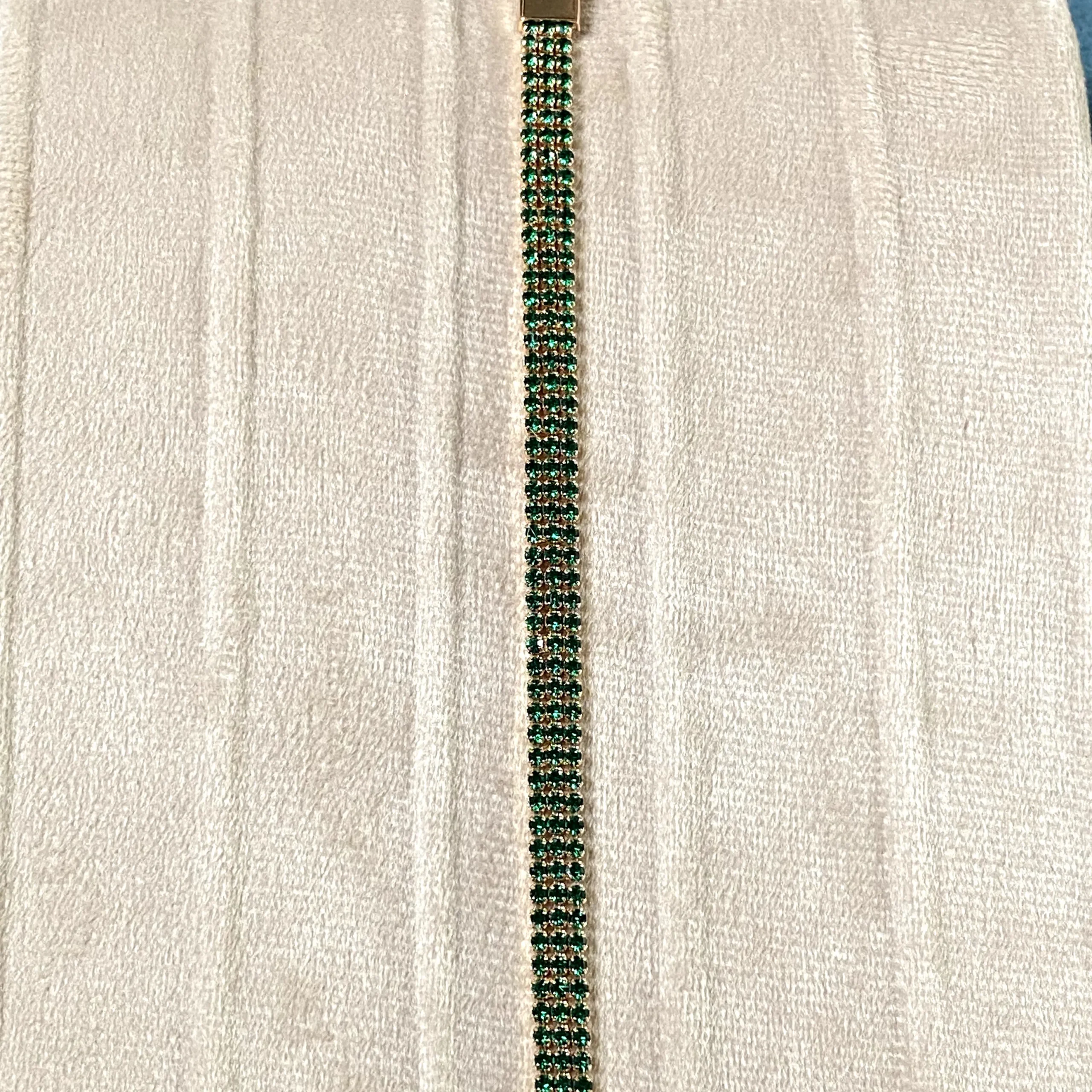 This exquisite tennis bracelet showcases a continuous line of rich emerald-colored stones, each meticulously set to create a seamless flow of brilliance. The refined craftsmanship highlights the striking contrast between the vivid green hues and the polished finish, making it a statement of sophistication and grace. Perfect for both luxurious evenings and everyday elegance, this bracelet is designed to be a lasting treasure in your collection.