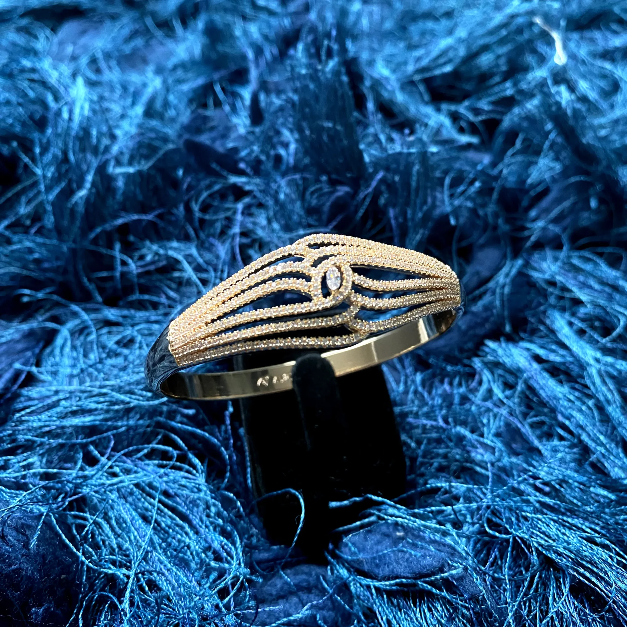 A 21k gold-plated bangle defined by flowing wave-like lines, converging at a marquise centerpiece. Its delicate symmetry and soft movement create a timeless, graceful look.