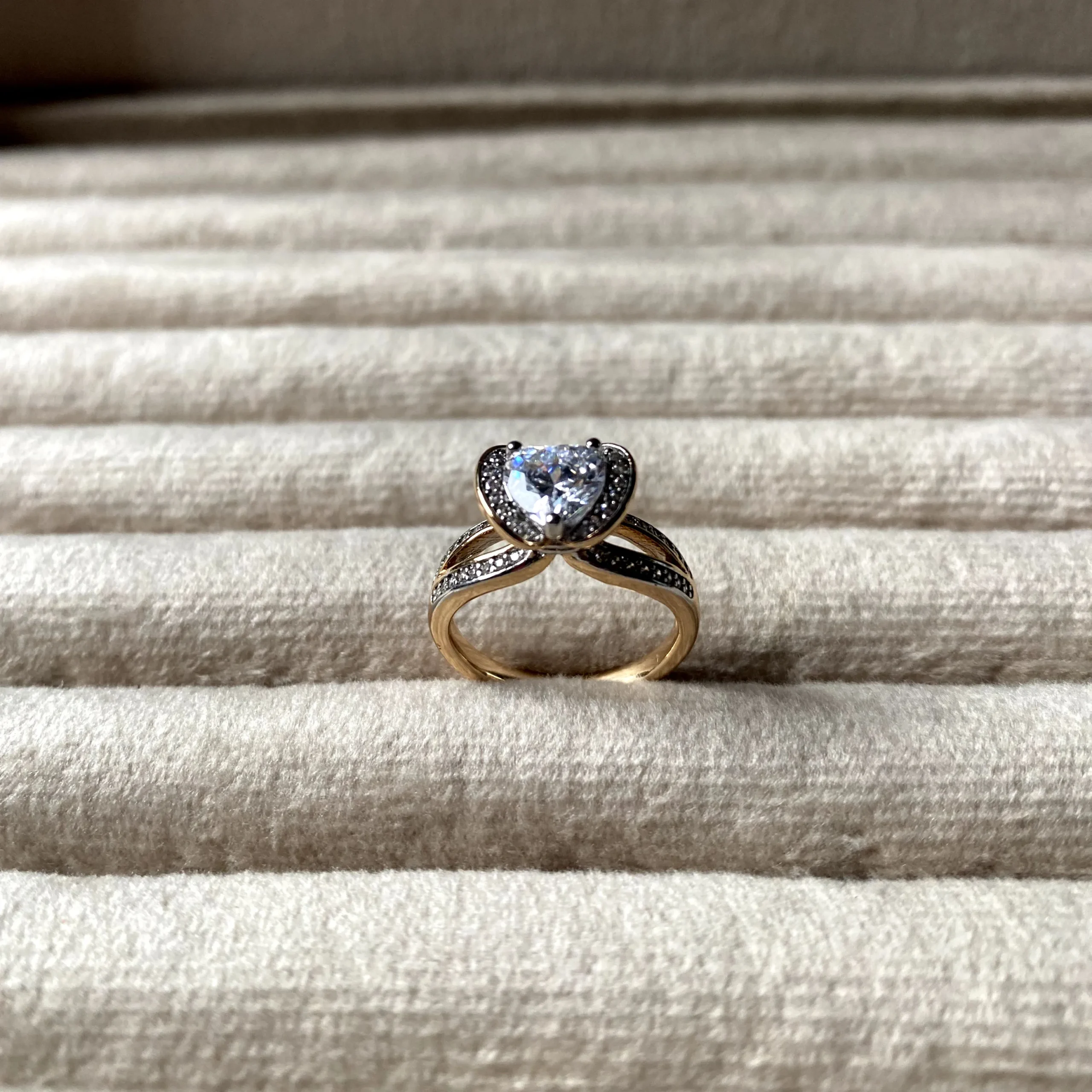 A radiant 21k gold-plated ring featuring a heart-shaped centerpiece embraced by shimmering mini stones.