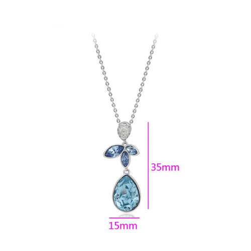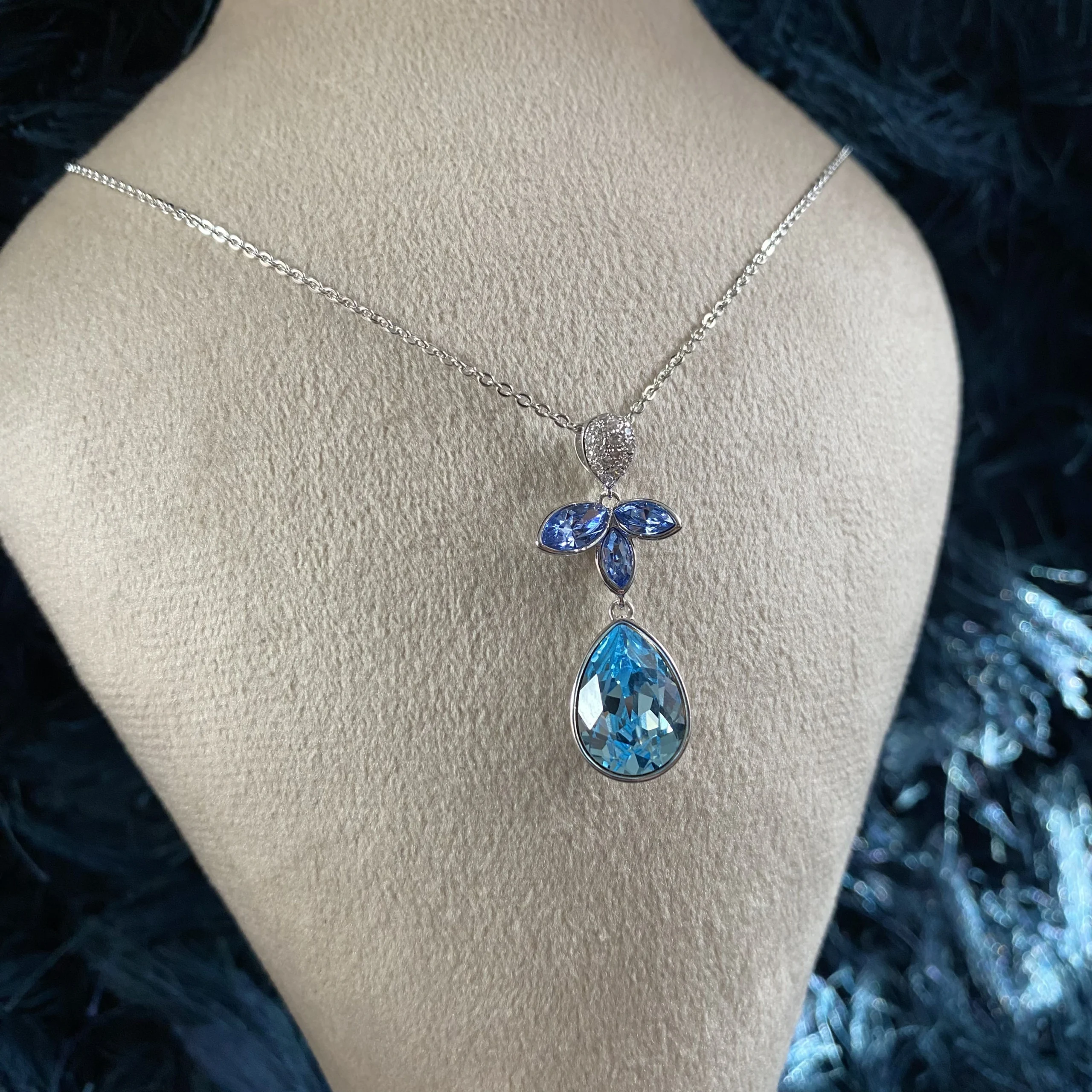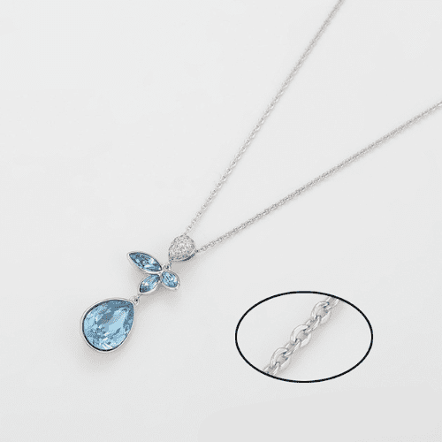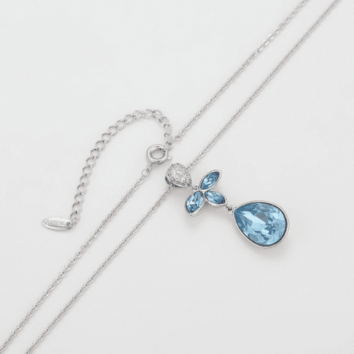 The Marina pendant reflects calm elegance through its platinum-plated finish and soft blue crystals. A teardrop gem anchors this graceful design, inspired by the stillness of the sea.