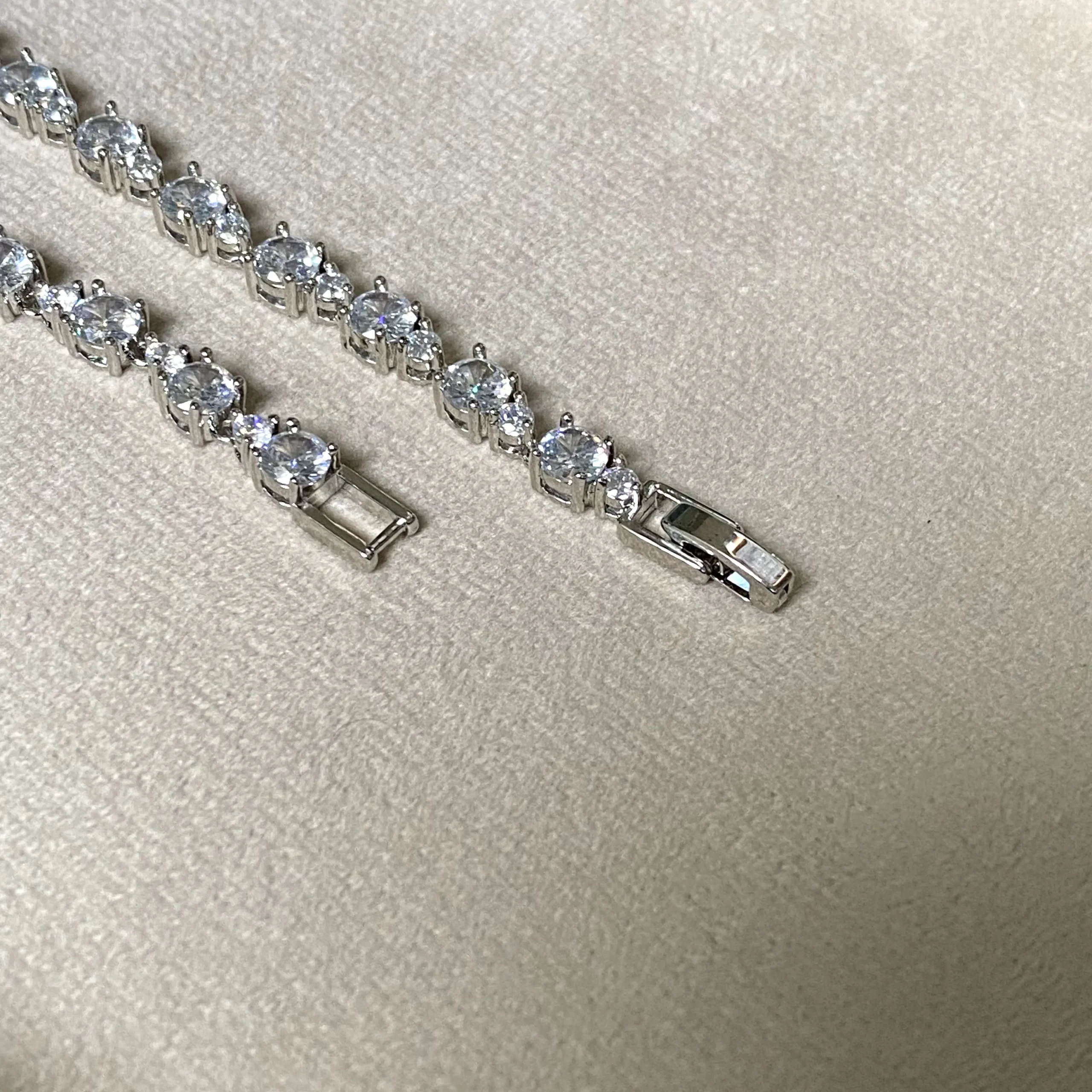 A refined silver bracelet with alternating round stones in a big–small pattern, creating a graceful rhythm of sparkle.