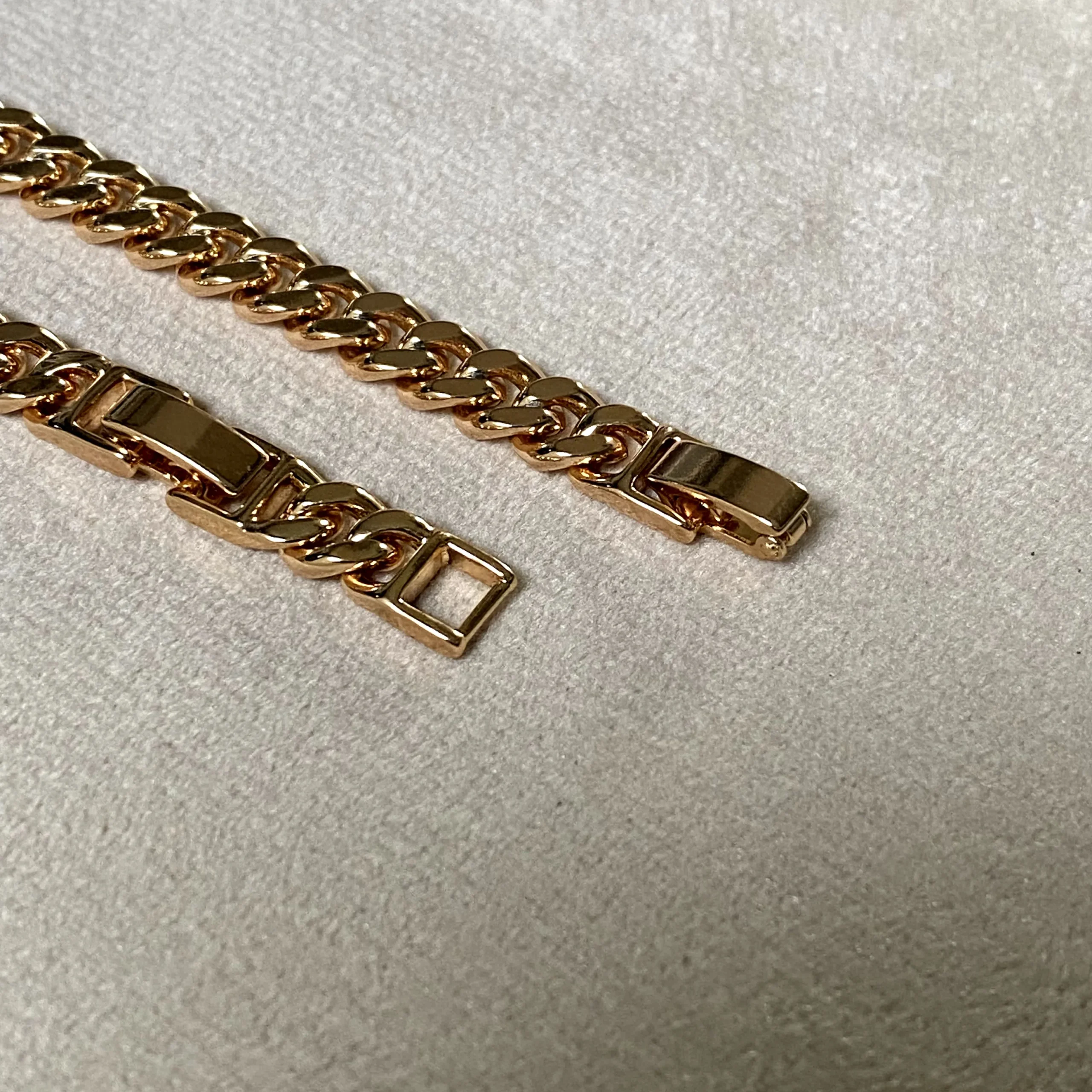 This elegant bracelet boasts a 21k gold plated chain with a sophisticated interlocking link design. The combination of the gold chain and zircon accents creates a beautiful and eye-catching piece of jewelry, perfect for special occasions or everyday wear.
