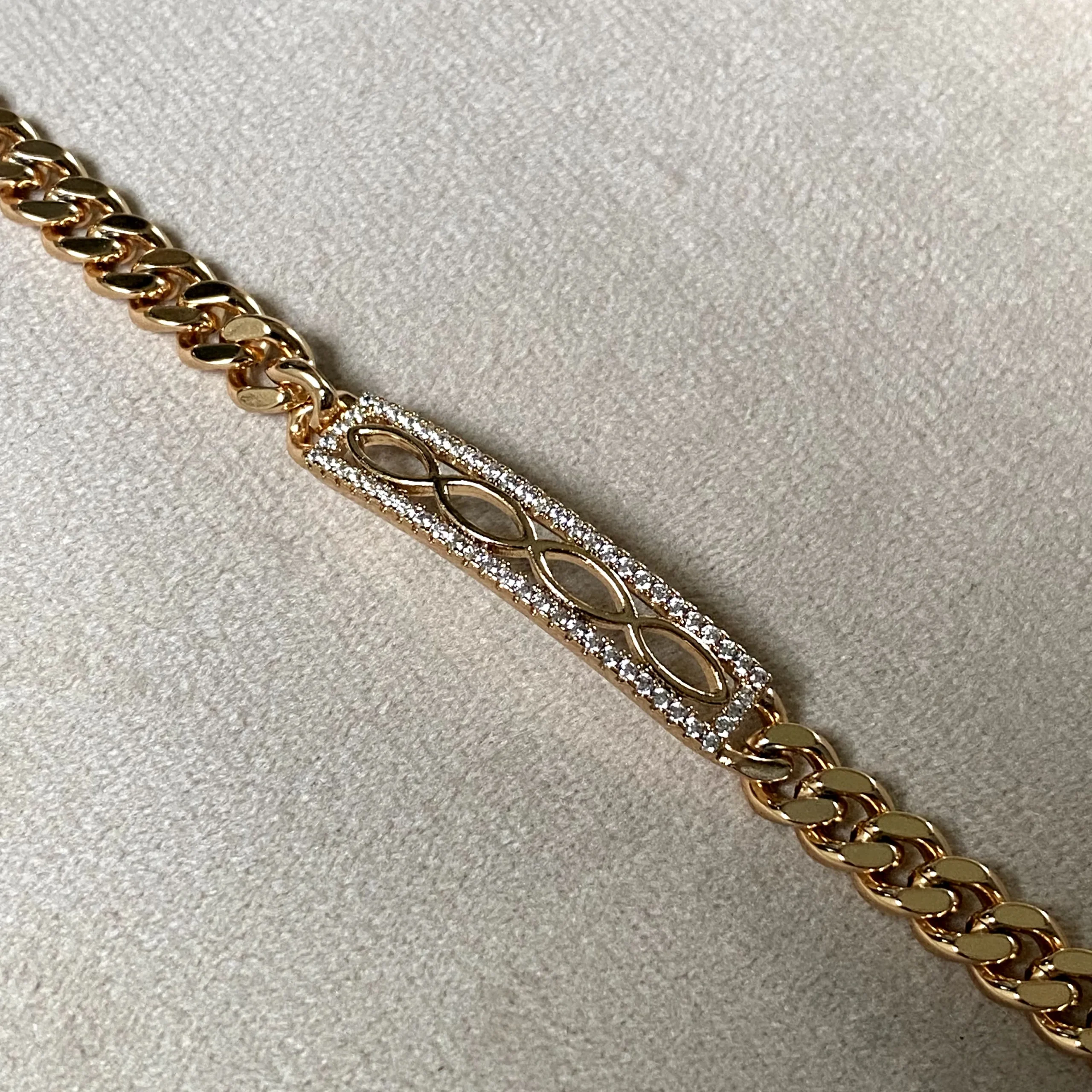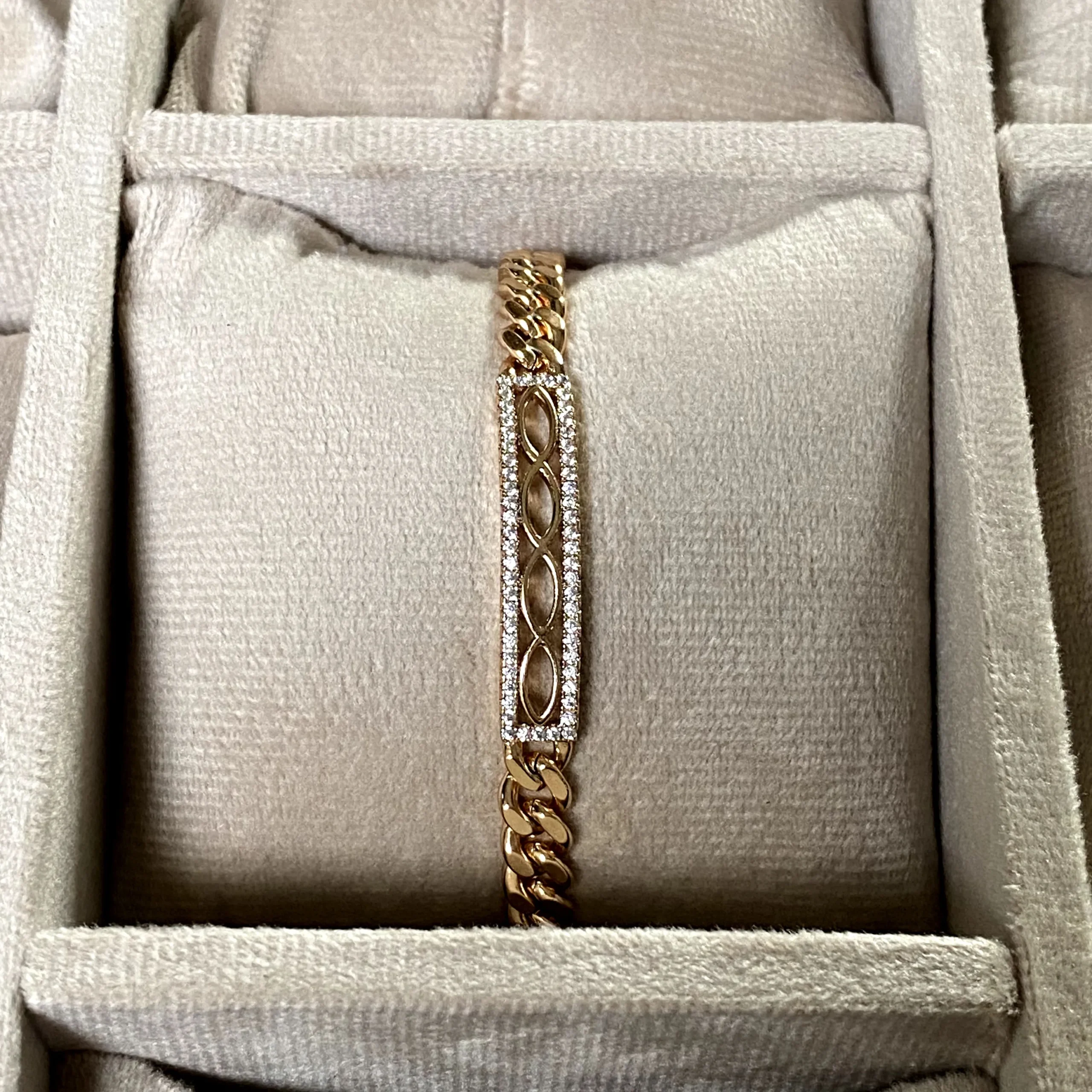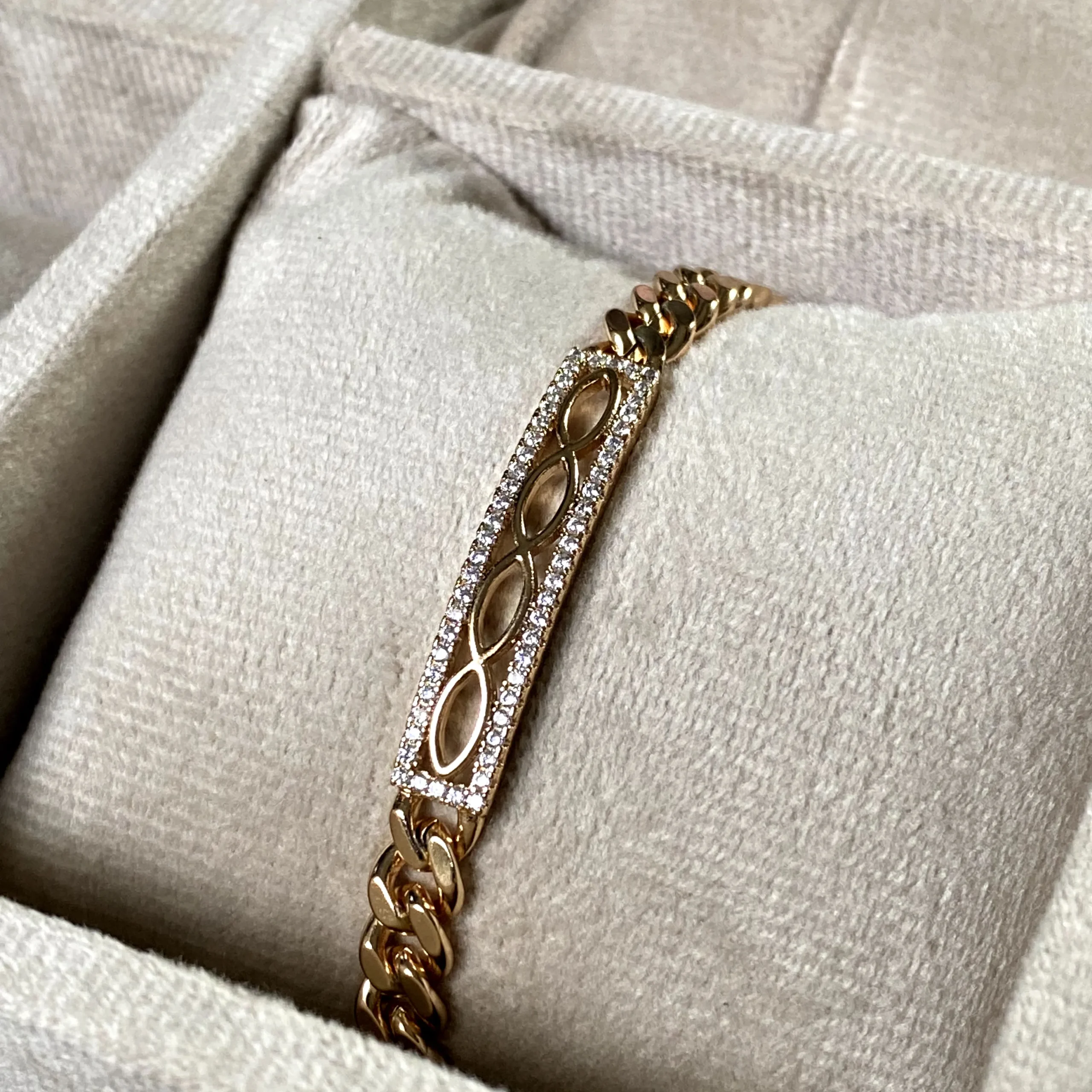 The bracelet features a 21k gold plated chain with an intricate interlocking link design and zircon encrusted centre piece boundary