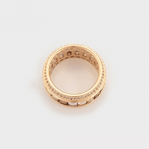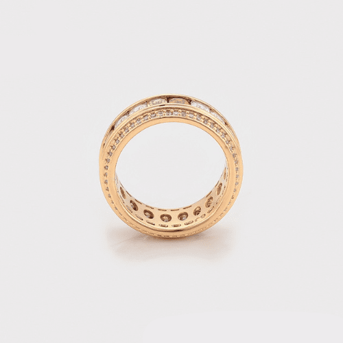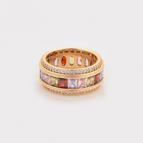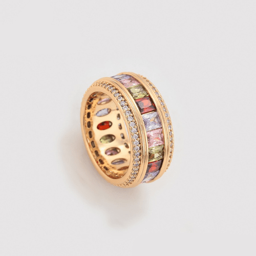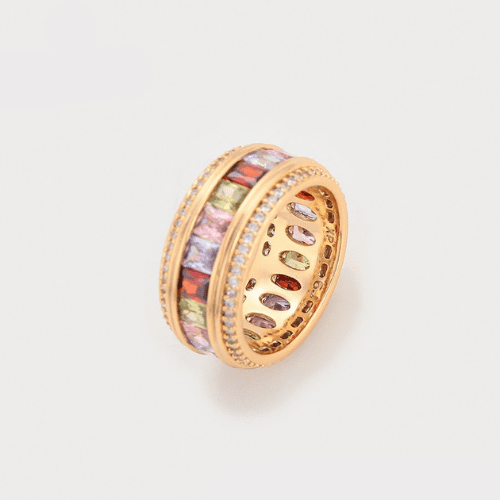 The rectangular stones create a structured and rhythmic flow around the band. Each tone catches the light differently, adding depth and dimension. Meanwhile, the clear stones along the borders enhance brightness without overpowering the colours. As a result, this gold-style ring feels eye-catching yet controlled. The design maintains harmony through symmetry and precision.