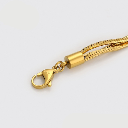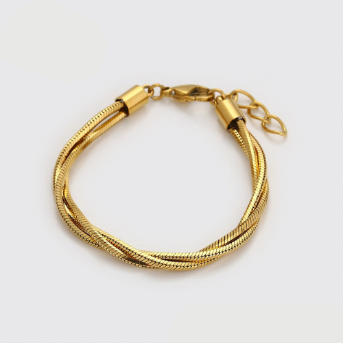 This gold-plated bracelet features a distinctive three-layer looped design that creates depth and visual interest while maintaining a sleek, balanced silhouette. The interwoven strands enhance light reflection, giving the bracelet a subtle yet luxurious shine.
