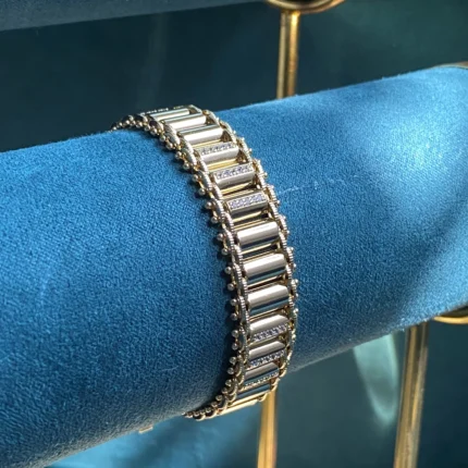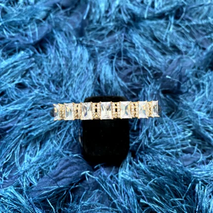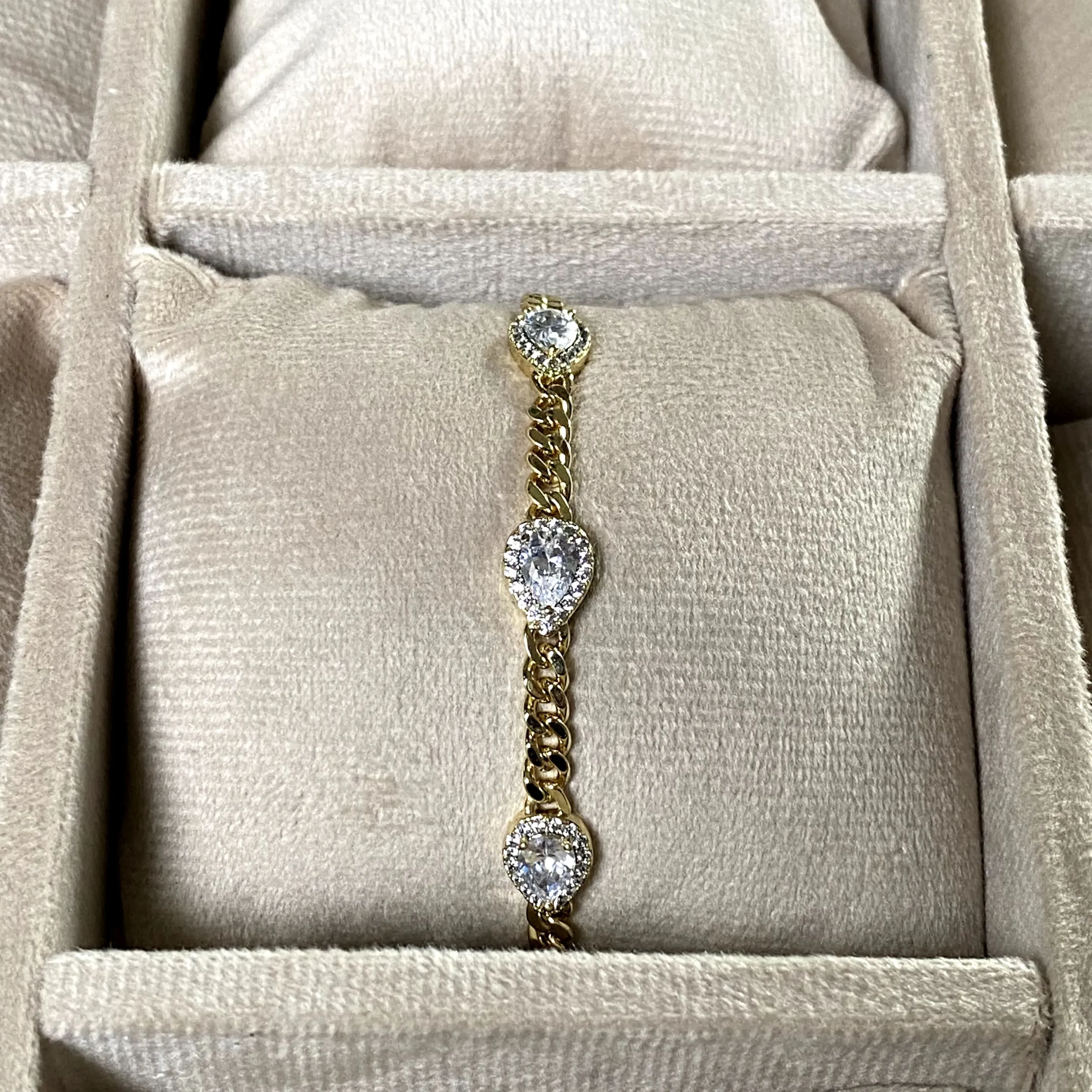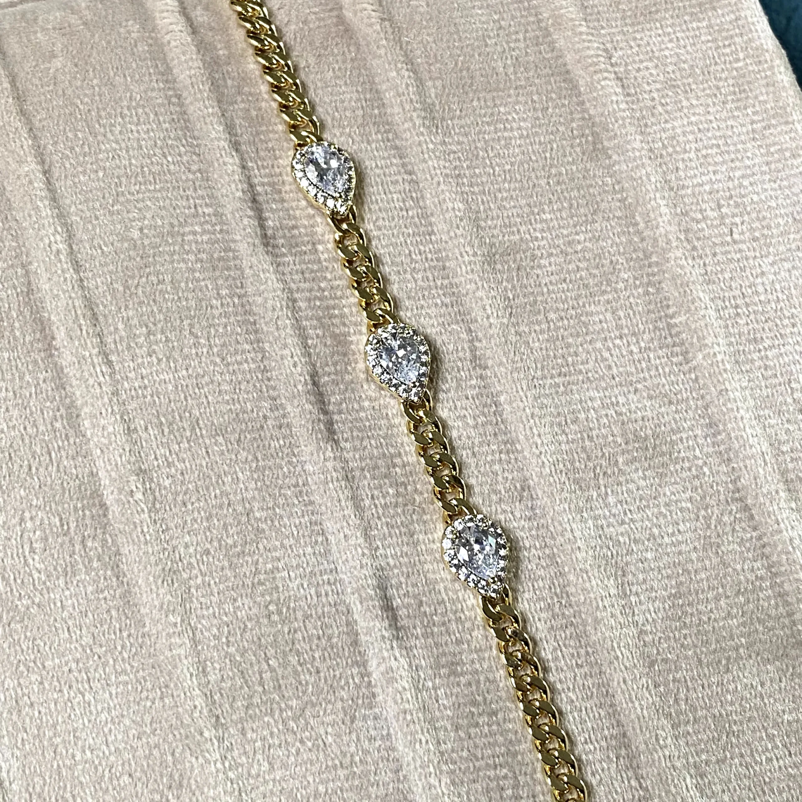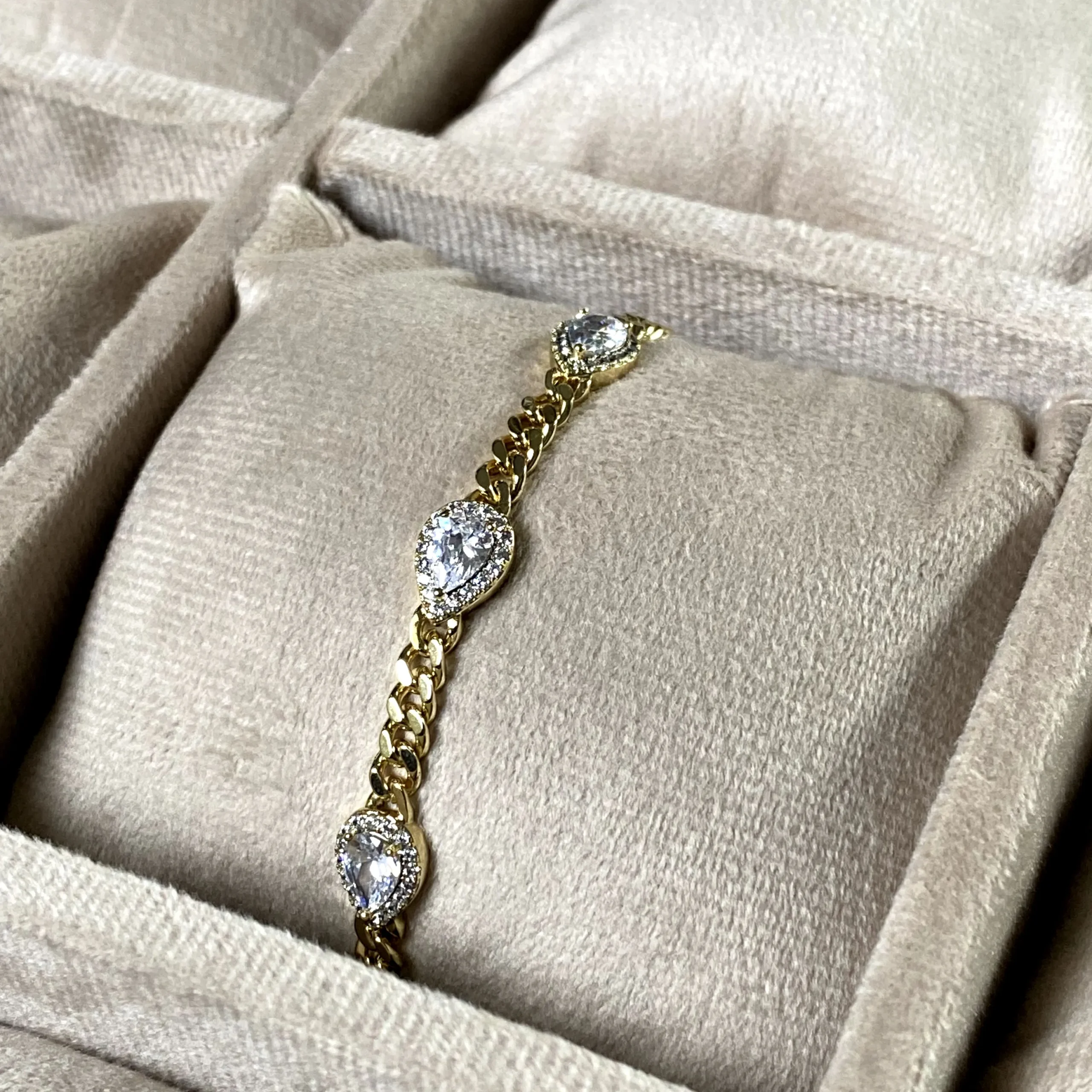 This bracelet blends classic charm with a touch of modern style. The textured gold curb chain carries three pear-shaped zircon stones, each framed with smaller crystals for extra brilliance. Evenly spaced along the chain, these clusters create a balanced, elegant look that works beautifully for both everyday wear and special occasions.