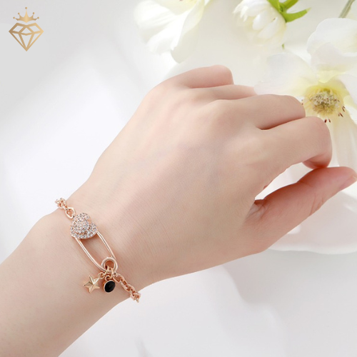 This gold-plated bracelet blends classic chain styling with modern charm detailing. At its center, a heart-shaped clasp encrusted with fine stones adds a subtle touch of brilliance, serving as both a focal point and functional closure.
