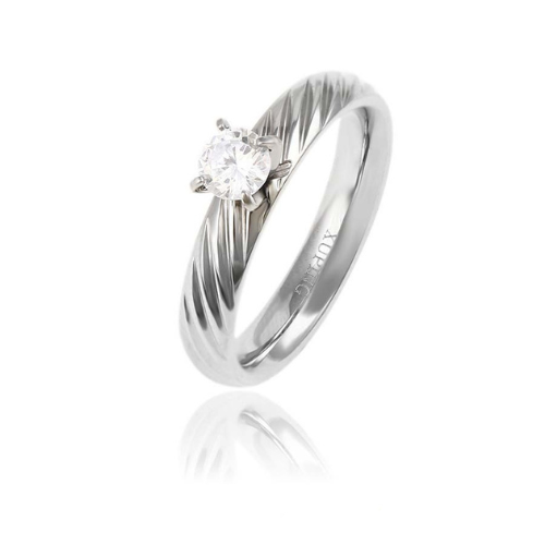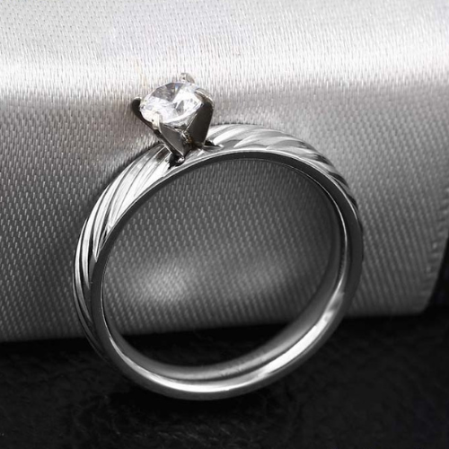 A platinum plated polished twisted band paired with a single clear stone, designed for effortless everyday wear.