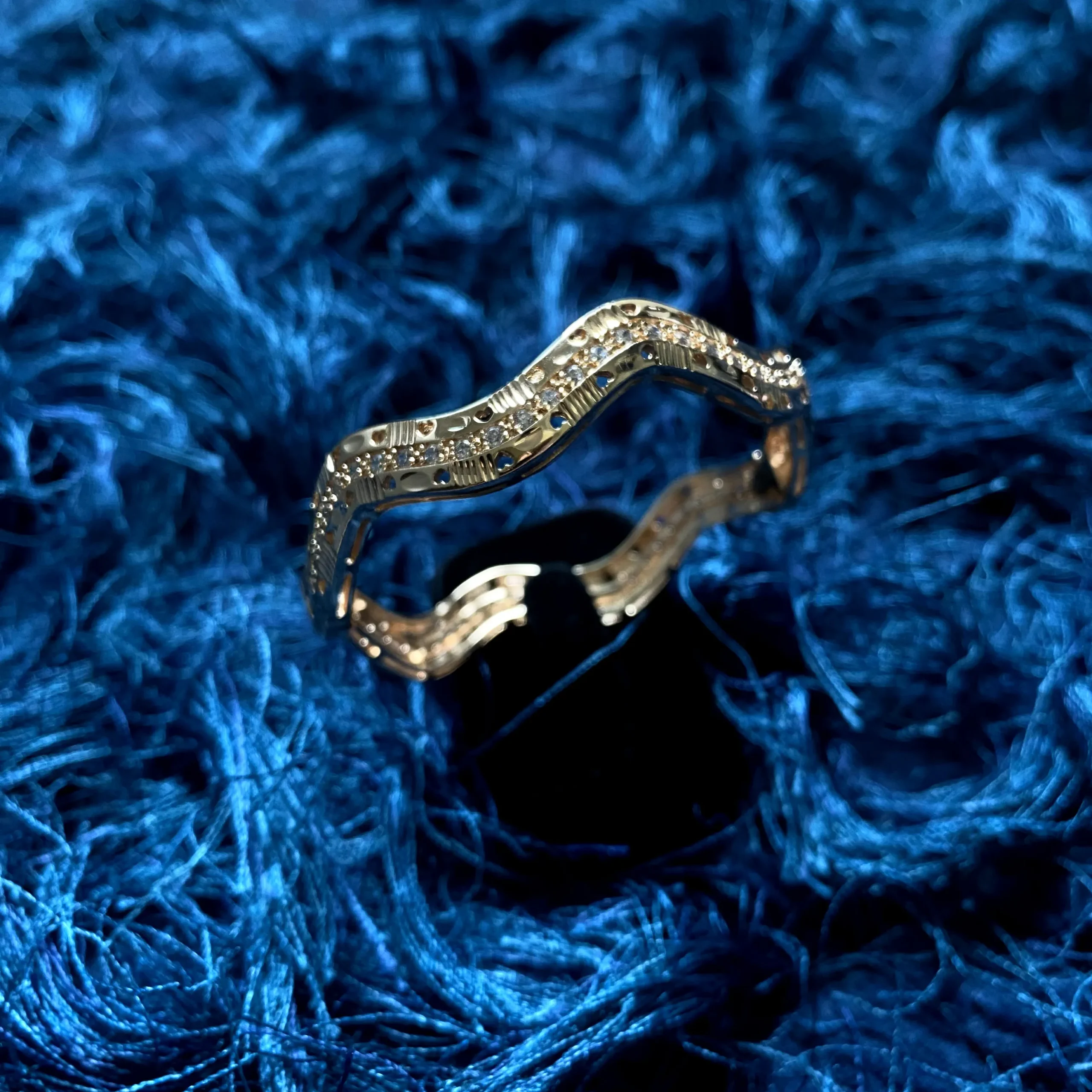 A 21k gold-plated bangle with a flowing wave design, accented by intricate cut-out details and polished finish.