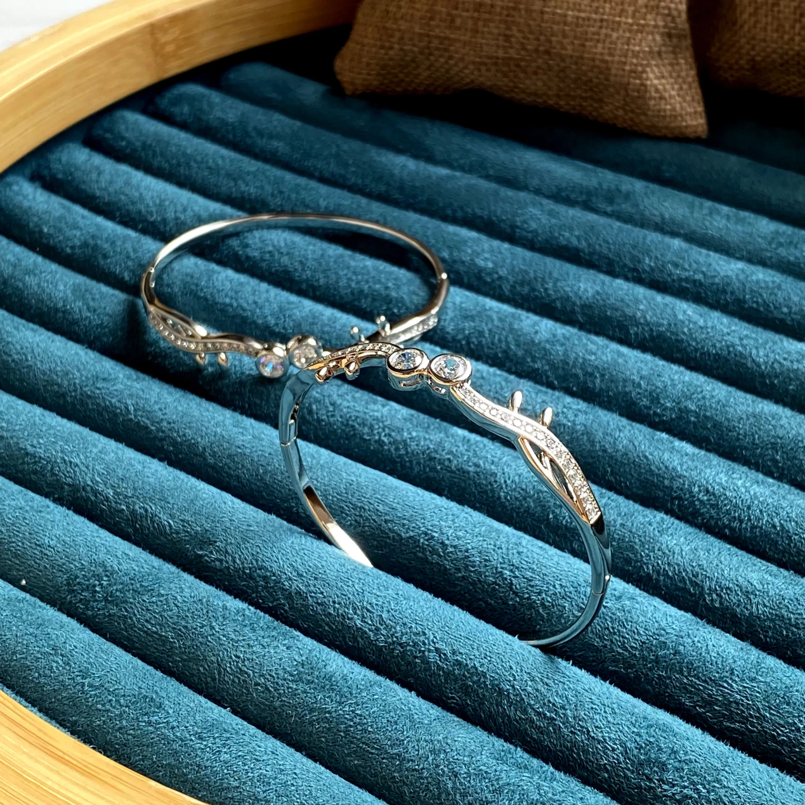 Adding a touch of distinction, slender stem-like accents frame the central motif, giving the piece depth and character without overpowering its minimal elegance. Lightweight yet striking, this bangle is versatile enough to complement both formal and everyday looks, making it a timeless addition to your jewellery collection.
