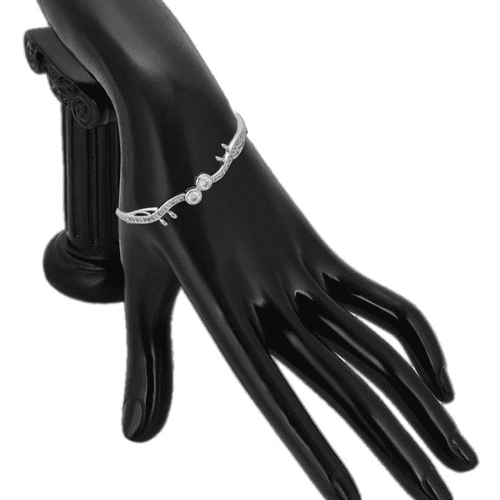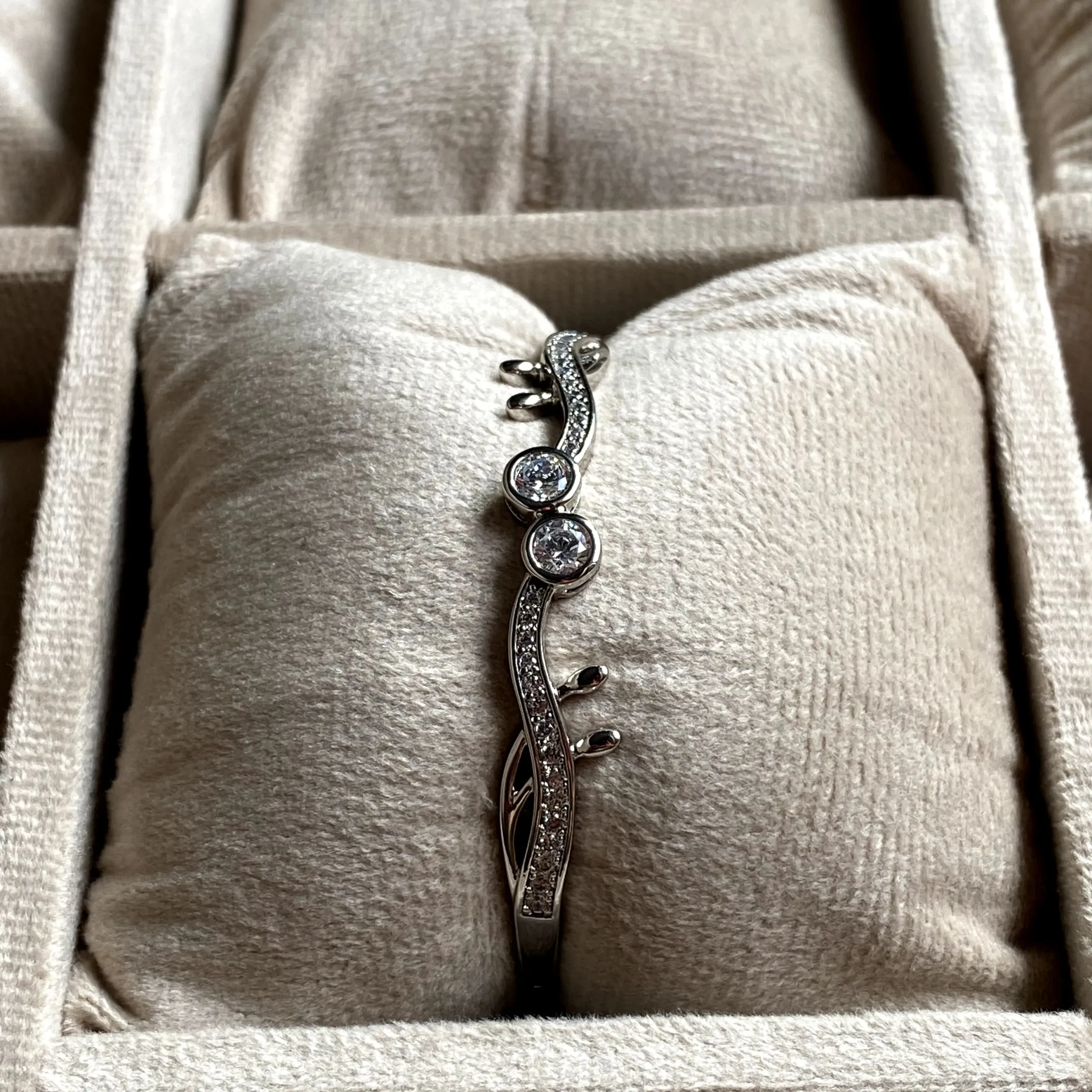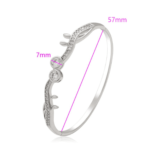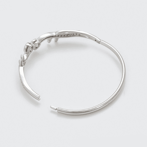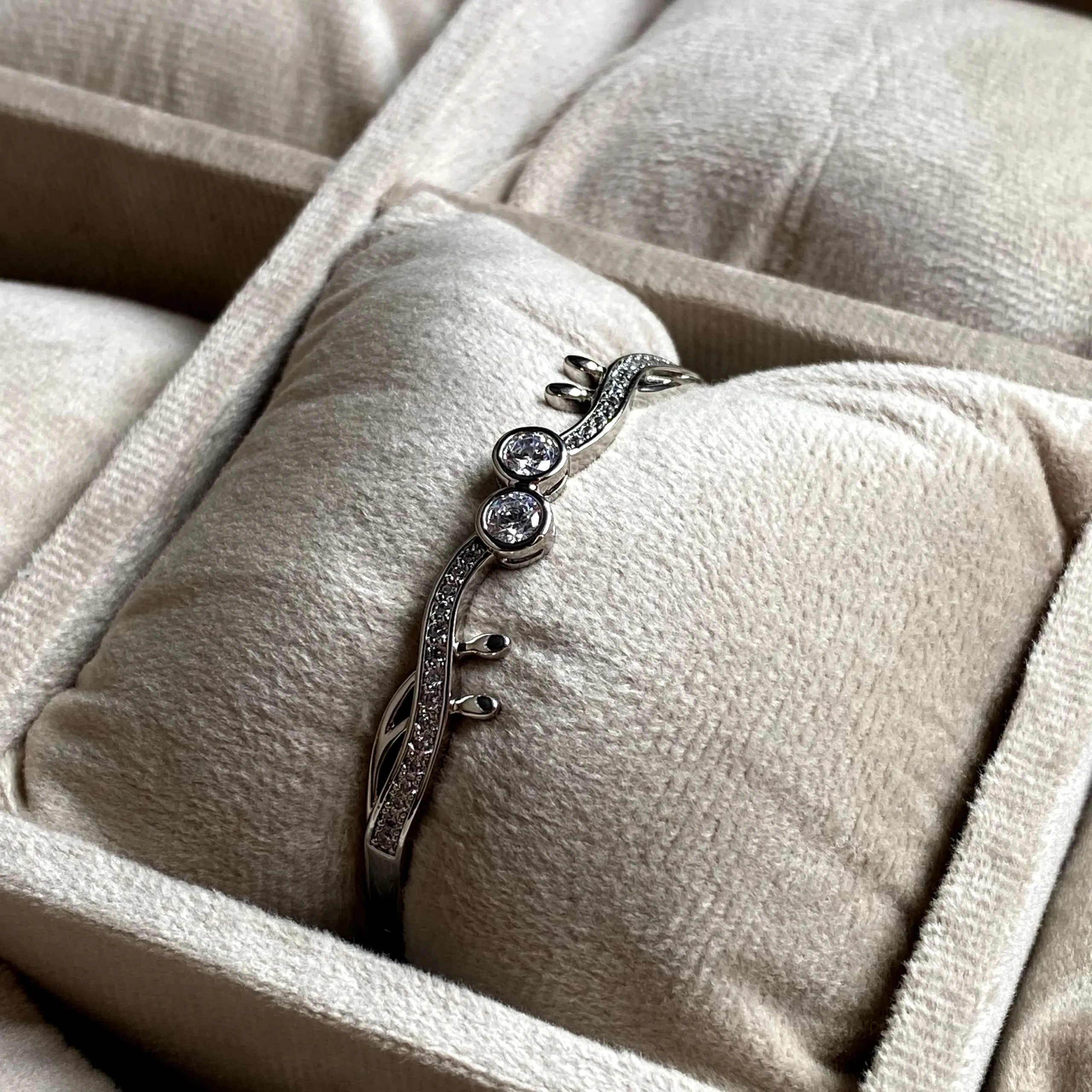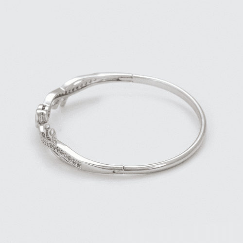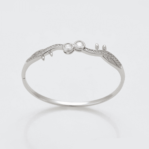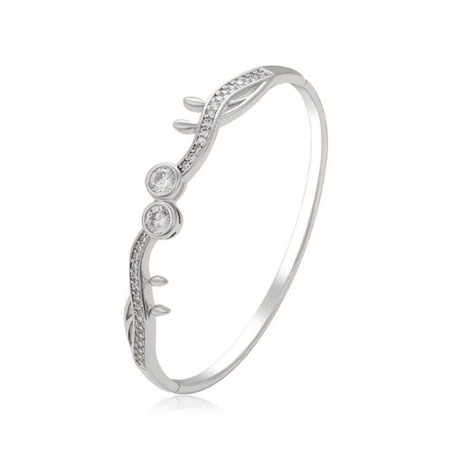 A platinum-plated bangle with a graceful curved design, accented by twin zircon circles and delicate stone detailing.